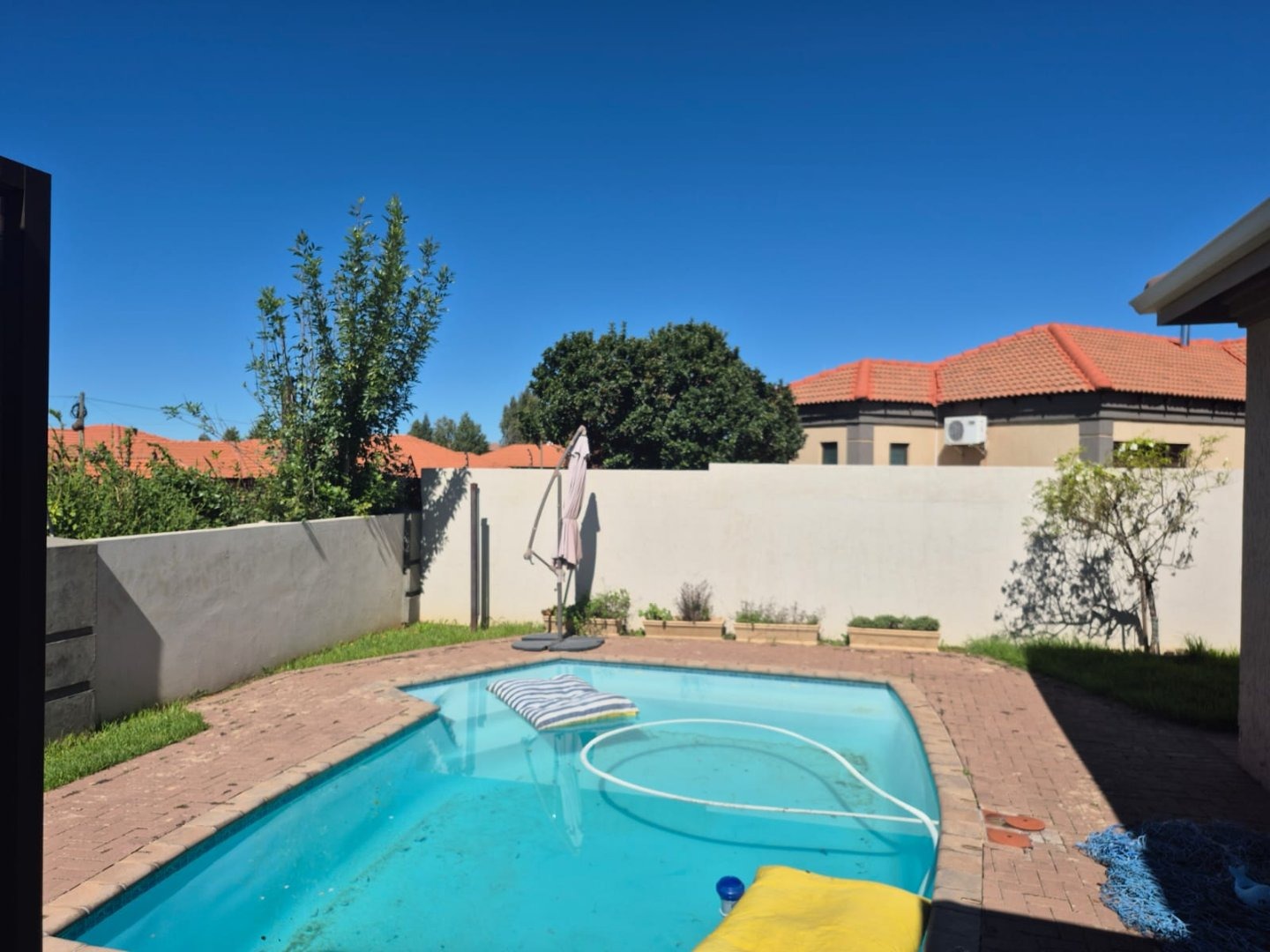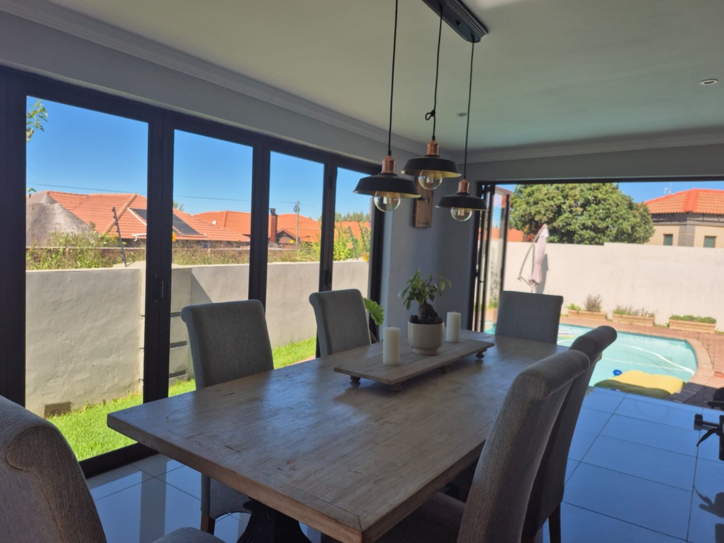 Designed for modern family life, the home boasts four spacious bedrooms, two full bathrooms, a guest toilet, and a study, providing the perfect balance of privacy and togetherness. The open-plan kitchen and lounge form the heart of the home, flowing effortlessly onto an enclosed patio with a built-in braai, overlooking a sparkling swimming pool and an additional outdoor patio — perfect for relaxing weekends or hosting unforgettable gatherings.
