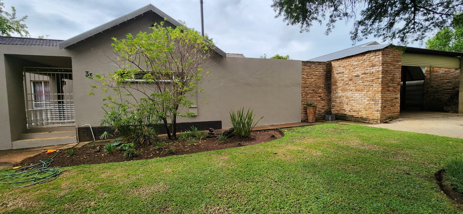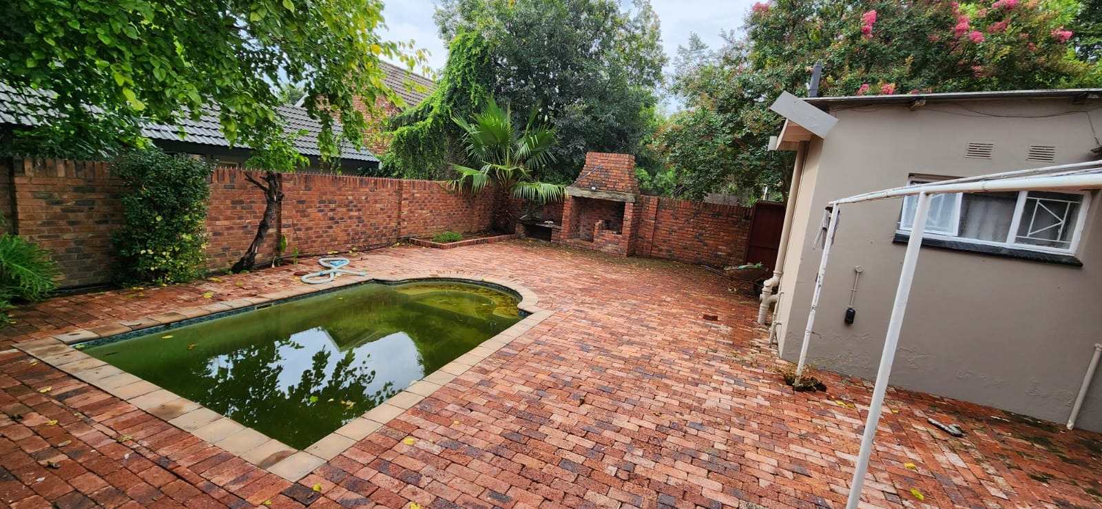 The outdoor area has been designed with both enjoyment and ease of maintenance in mind. The garden is neatly maintained and thoughtfully laid out, creating a pleasant setting that can be appreciated without demanding extensive upkeep. An open-air braai area with built-in braai forms a natural focal point for outdoor entertaining, ideal for relaxed weekend gatherings, family celebrations, or simply enjoying the pleasant South African climate with friends and loved ones. Inside the home, a fireplace introduces warmth and character, providing a cosy atmosphere during cooler evenings and adding an element of charm to the living space.