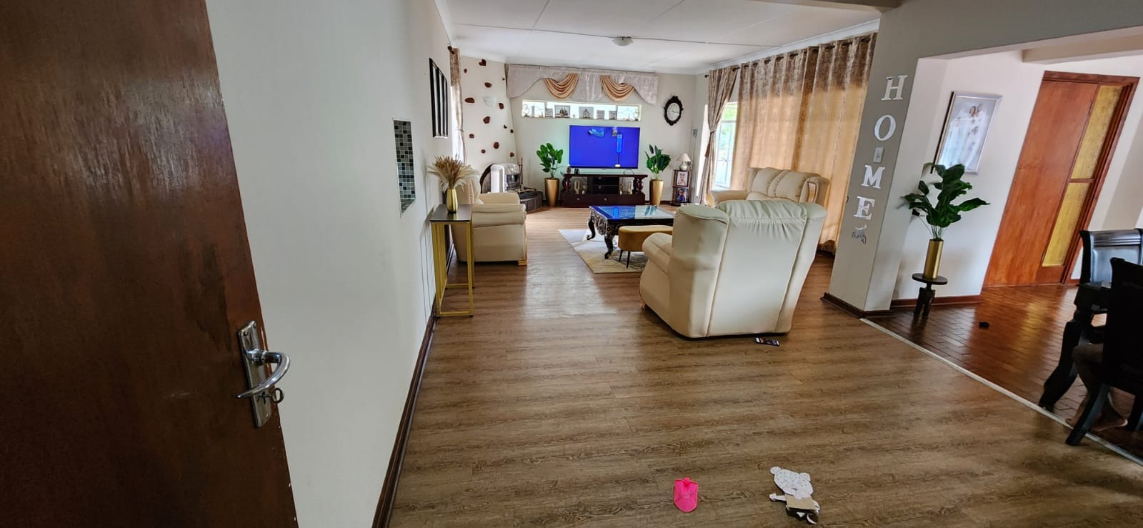 Living and entertaining are effortlessly accommodated through two comfortable lounge areas as well as a dedicated dining room. These spaces are thoughtfully arranged to allow for both intimate family moments and larger social gatherings. Whether enjoying a quiet evening with loved ones or hosting friends for a special occasion, the home provides the flexibility to suit a variety of lifestyles. The design encourages natural flow between the living areas, contributing to a warm and welcoming environment that truly feels like home.
