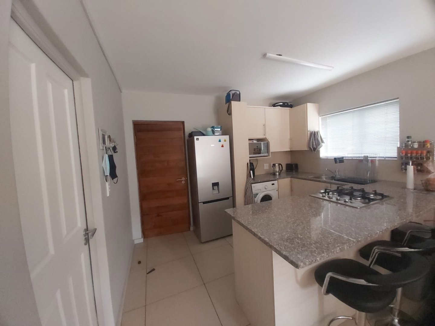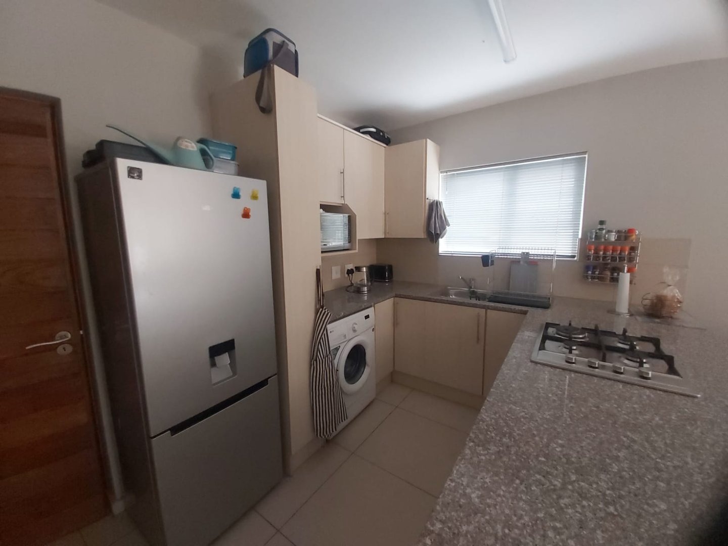 59m² 2 bedroom and 2 bathroom unit. Top-quality large porcelain tiles are used throughout the complex and all counter tops are granite with a lot of pale wood built-in cupboards in both kitchen and bedrooms and include many stunning features. Open plan lounge with sliding door leading to stoep. The kitchen is equipped with a gas hob and has a place for your washing machine.