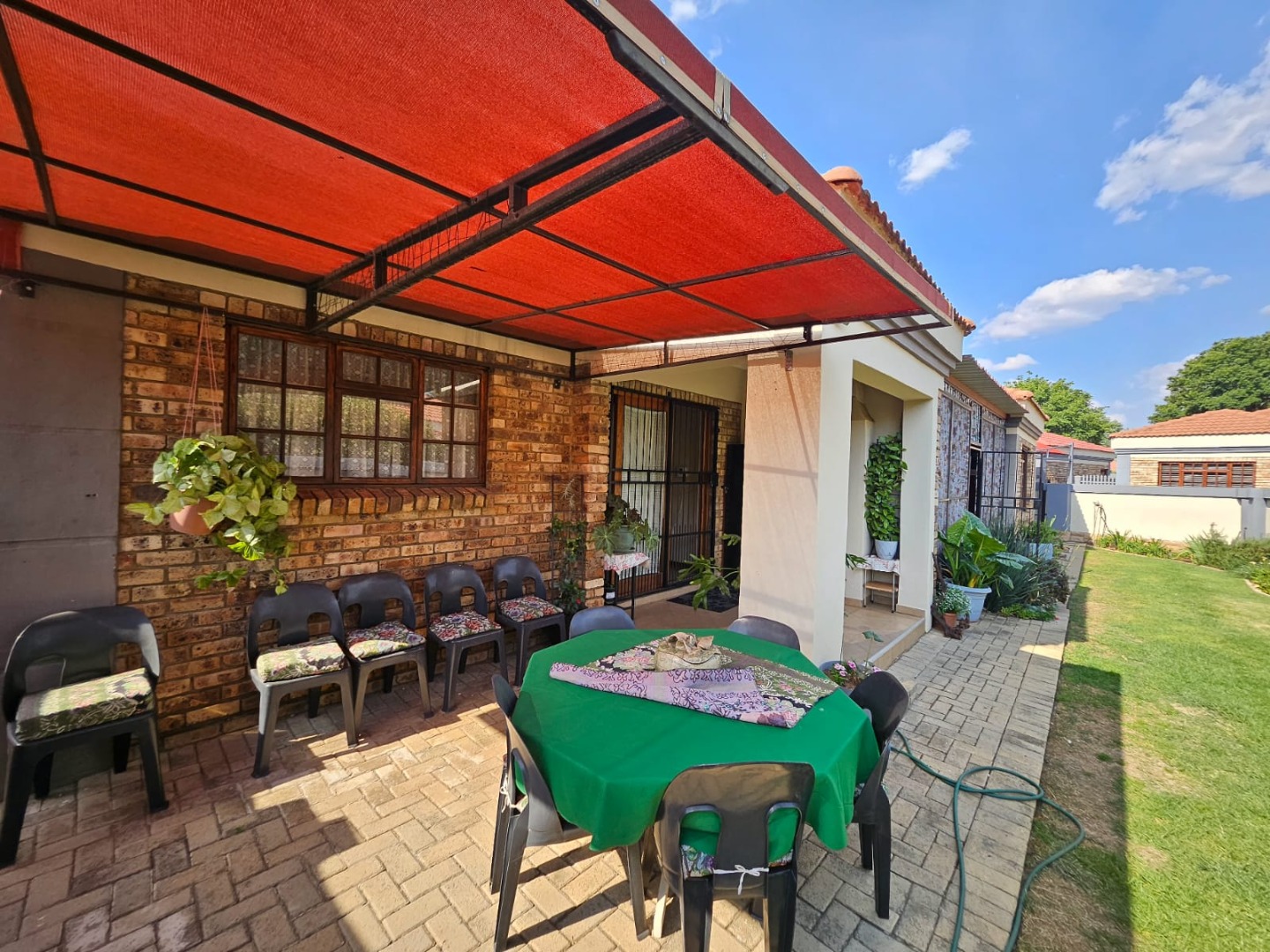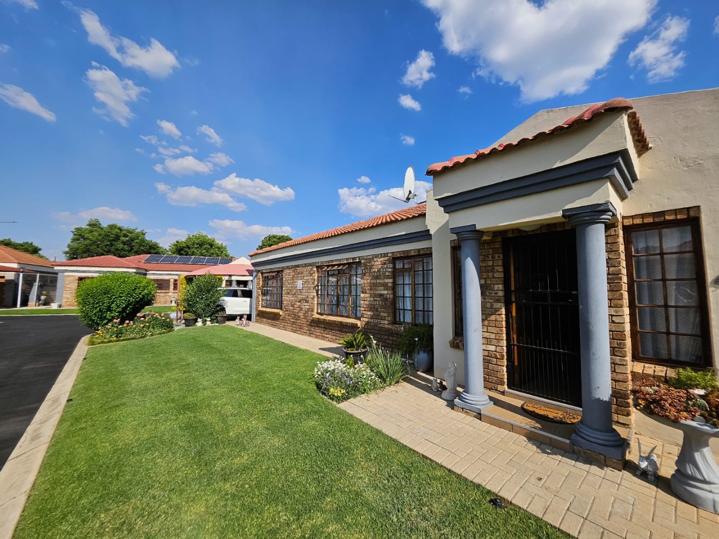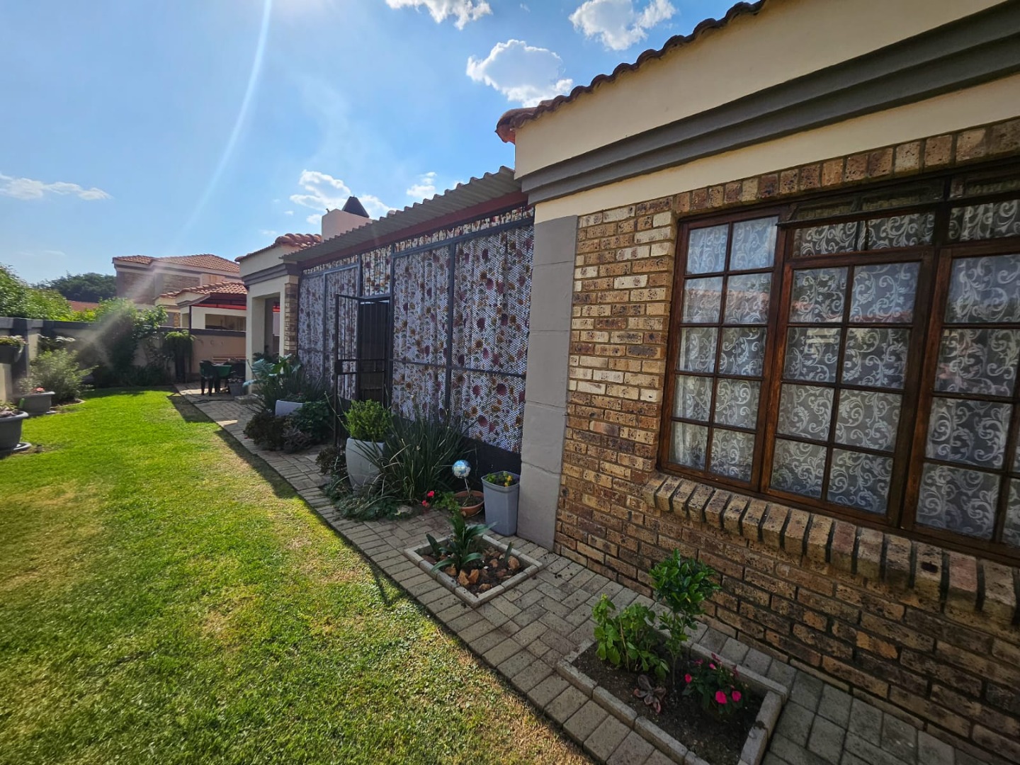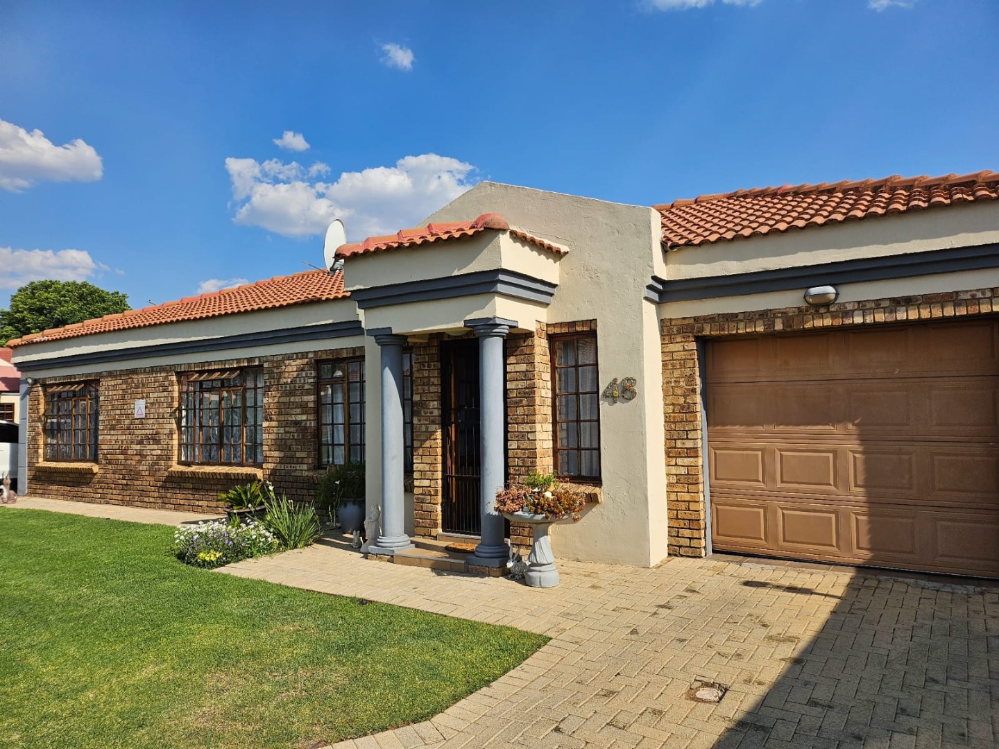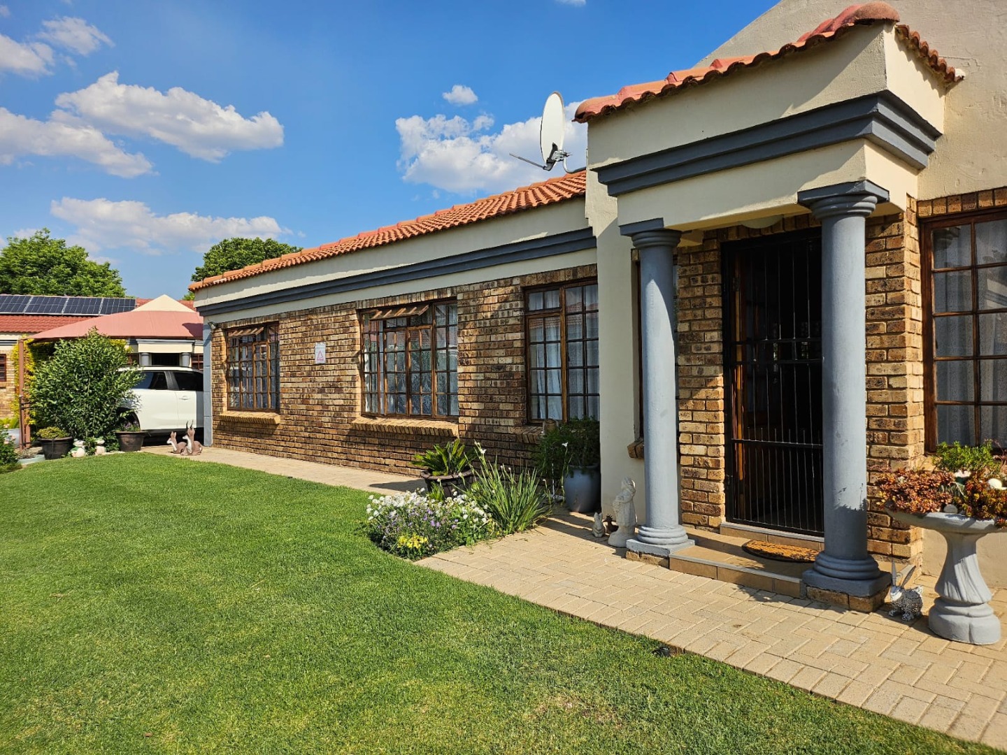 This charming single-story home presents a neat brick and painted plaster exterior complemented by a tiled roof, offering a welcoming first impression. A well-maintained front lawn, paved driveway, and a pillared entrance enhance its curb appeal, while security bars on windows and a security gate provide peace of mind.