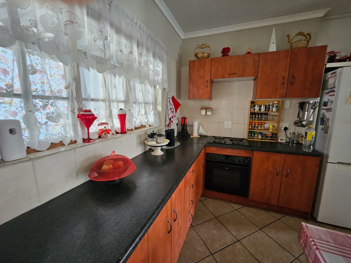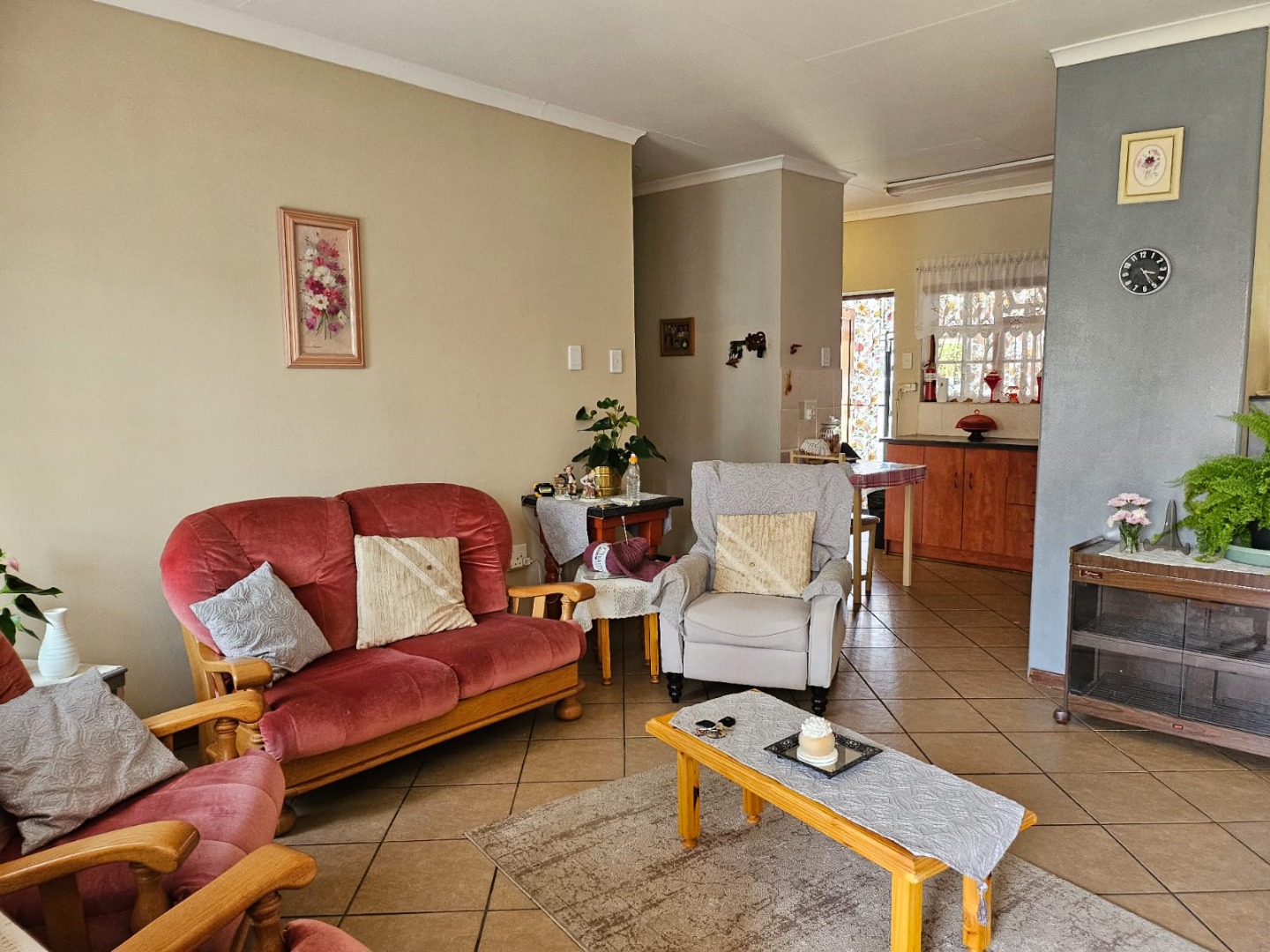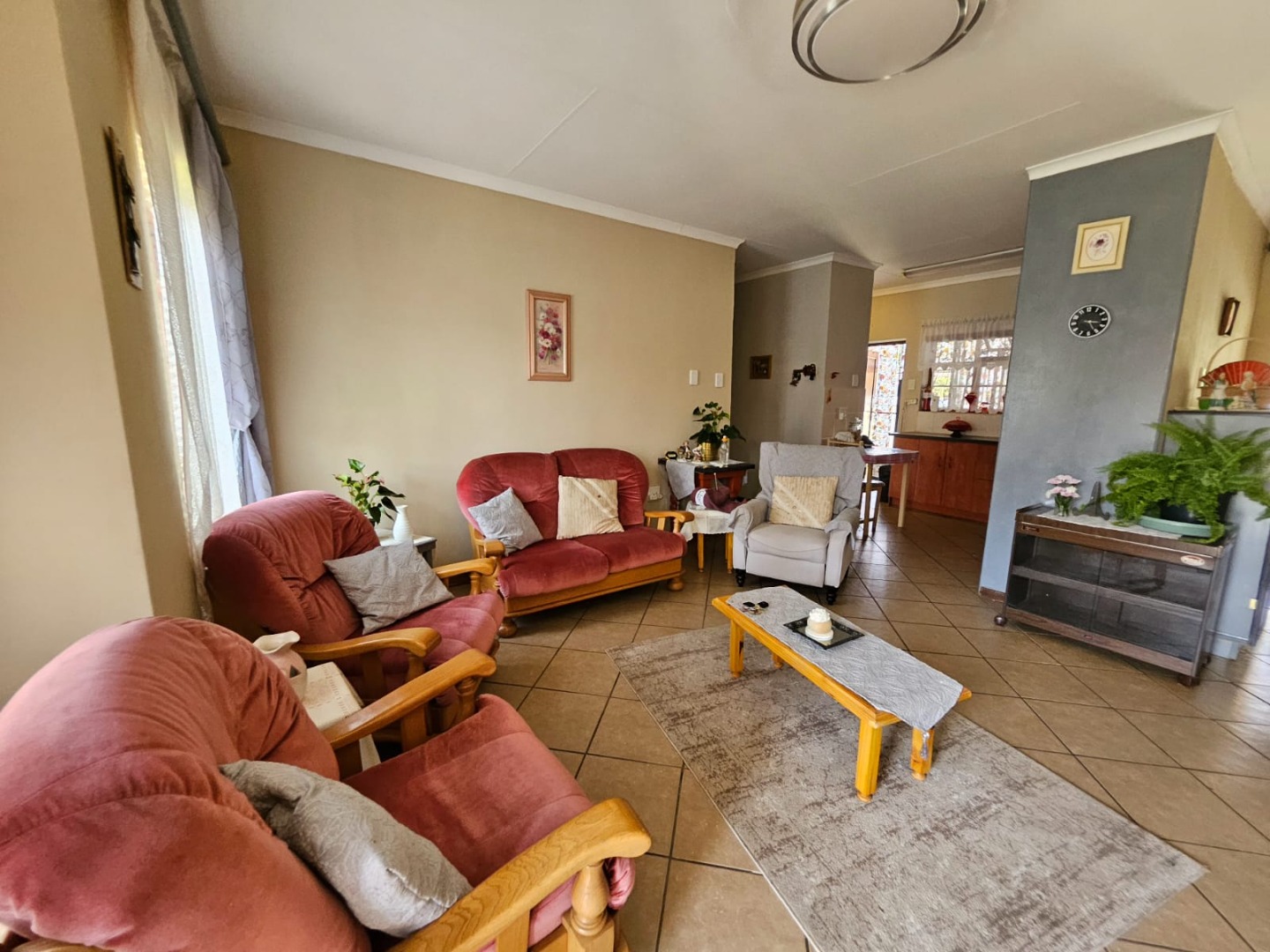 Inside, a spacious lounge with tiled flooring and ample natural light provides a comfortable setting for daily living. The functional kitchen features generous counter space, base cabinet storage, a built-in stove/oven, and direct access to an outdoor area. While offering a traditional aesthetic, it serves as a practical space for culinary activities. The residence is equipped with air conditioning and fibre connectivity for modern convenience.