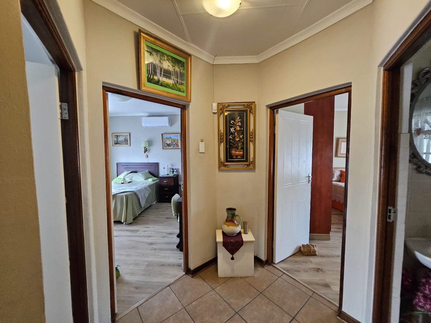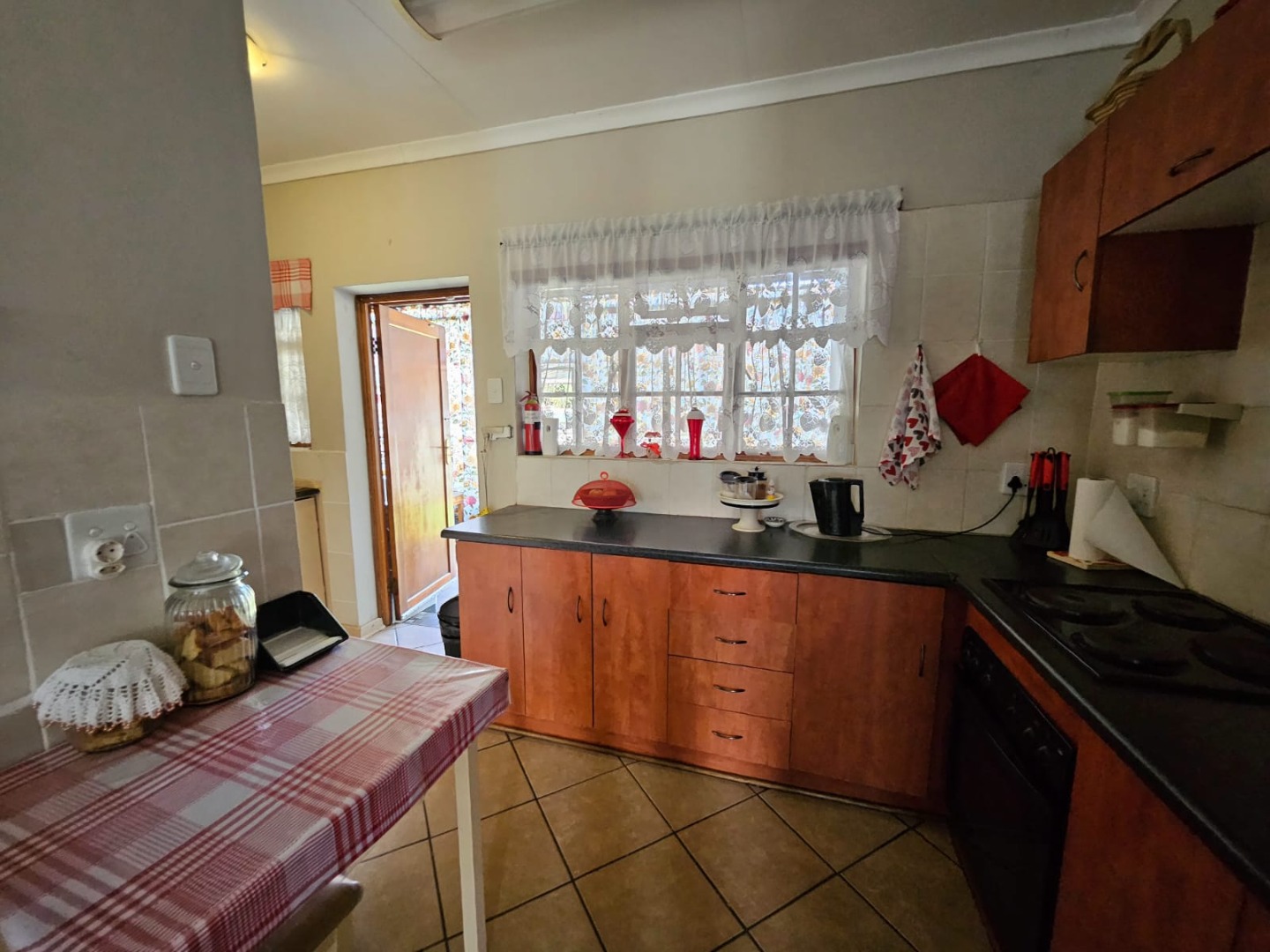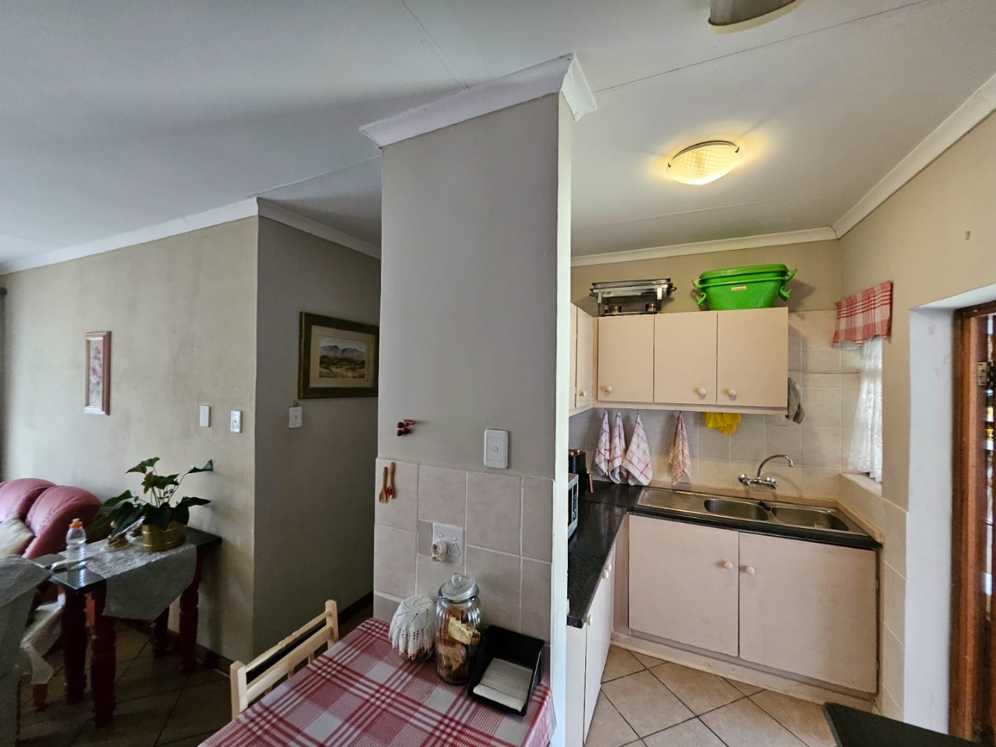 Inside, a spacious lounge with tiled flooring and ample natural light provides a comfortable setting for daily living. The functional kitchen features generous counter space, base cabinet storage, a built-in stove/oven, and direct access to an outdoor area. While offering a traditional aesthetic, it serves as a practical space for culinary activities. The residence is equipped with air conditioning and fibre connectivity for modern convenience.