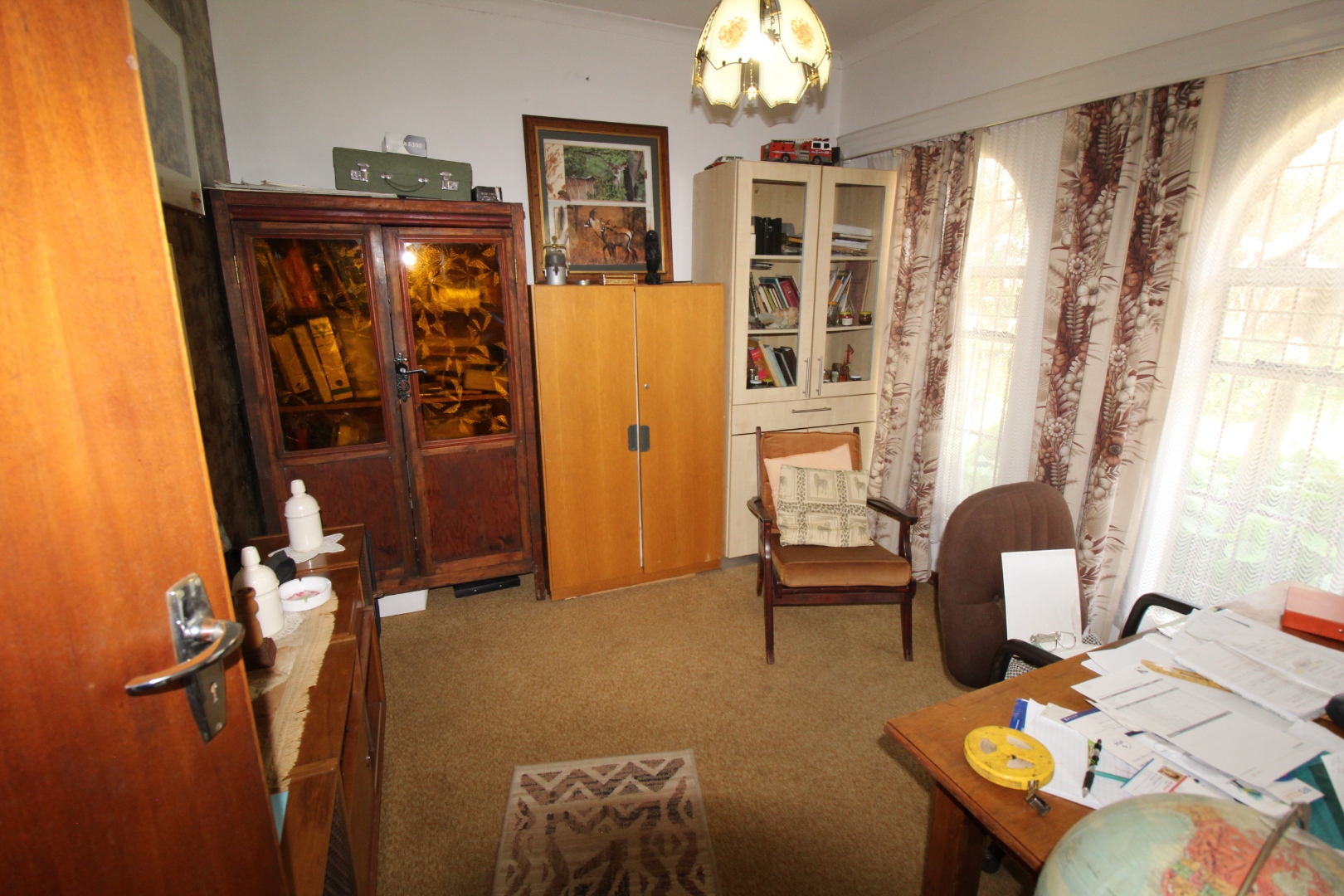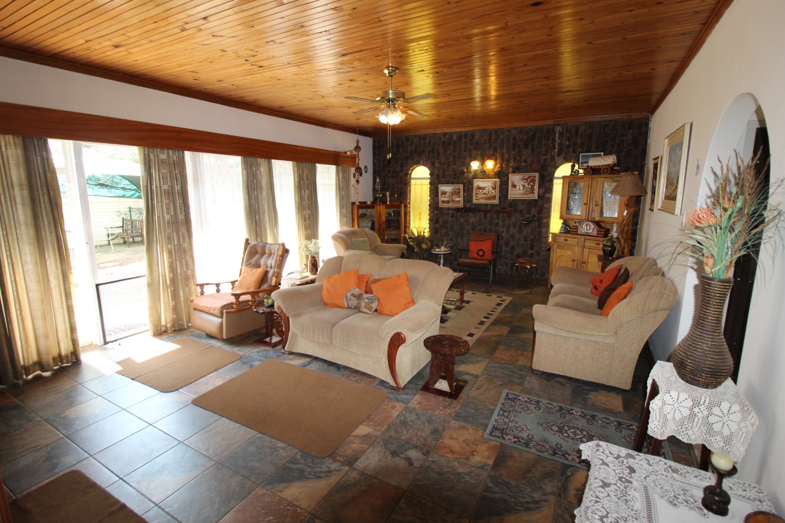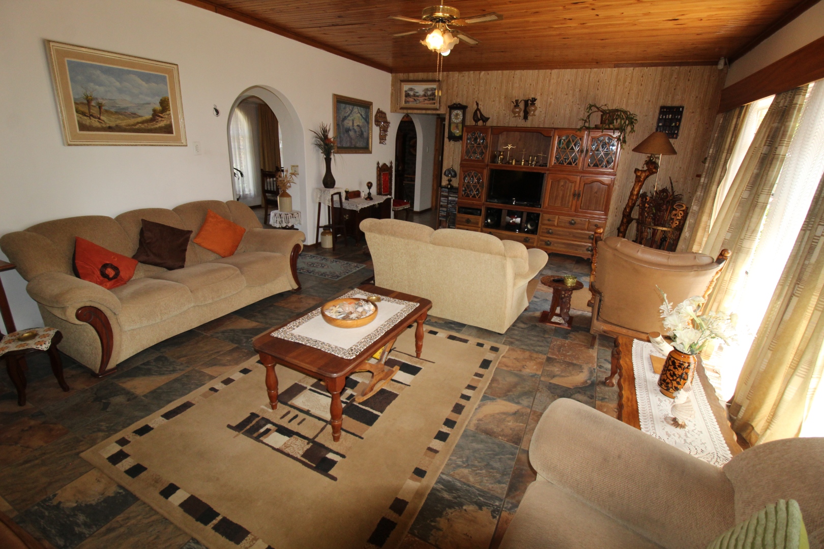 Upon entering, you are welcomed by a warm entrance hall with two spacious living areas, complemented by a separate dining room—ideal for both intimate family moments and special gatherings. The well-appointed kitchen, featuring ample built-in cupboards, truly forms the heart of the home, offering a perfect setting for culinary creativity and shared memories. There are a separate scullery and laundry area and a nice study as well.