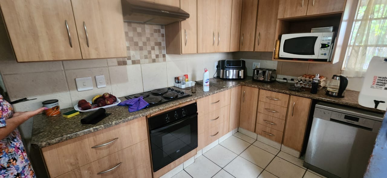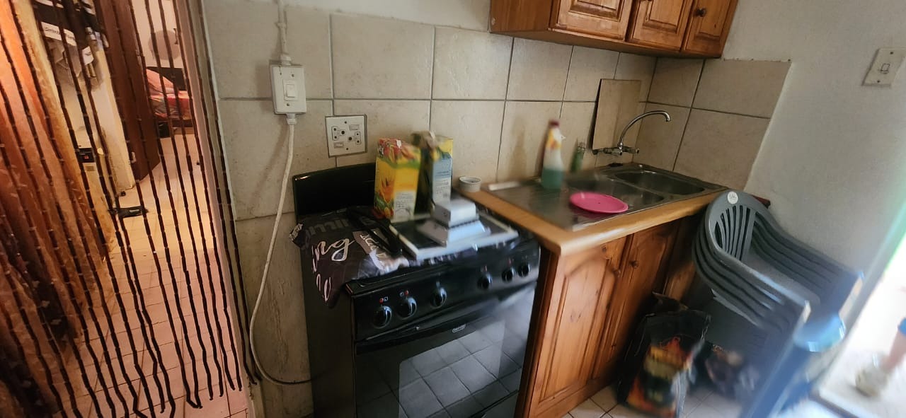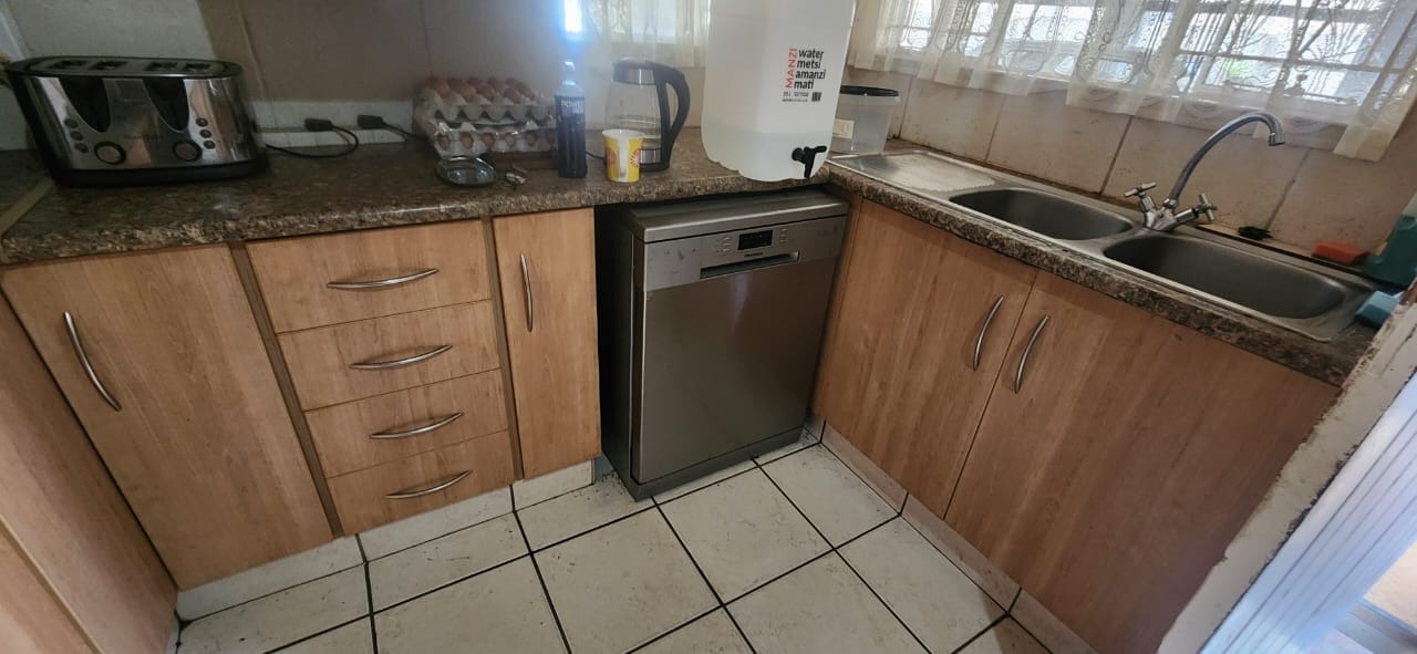 The main residence features three well-sized bedrooms, all fitted with built-in cupboards, and a neatly appointed full bathroom with a separate toilet. The kitchen has been tastefully renovated and offers ample cupboard space, seamlessly flowing into an open-plan lounge, dining area, and TV room. The property is equipped with prepaid electricity for added convenience.