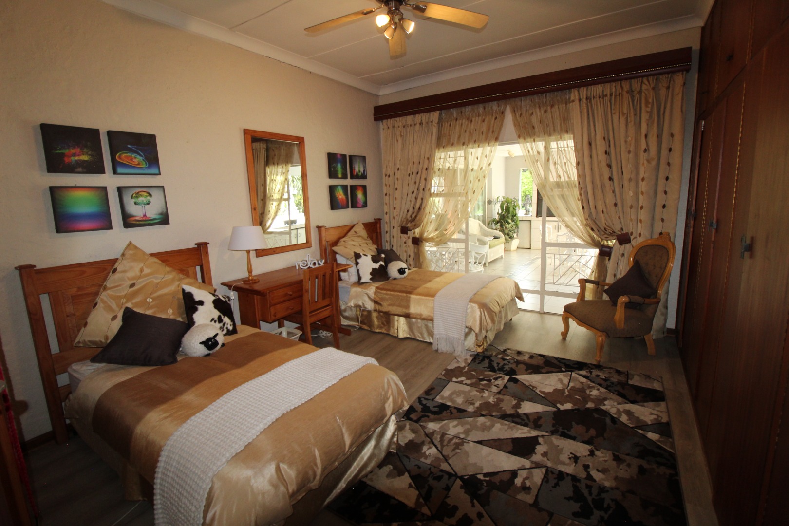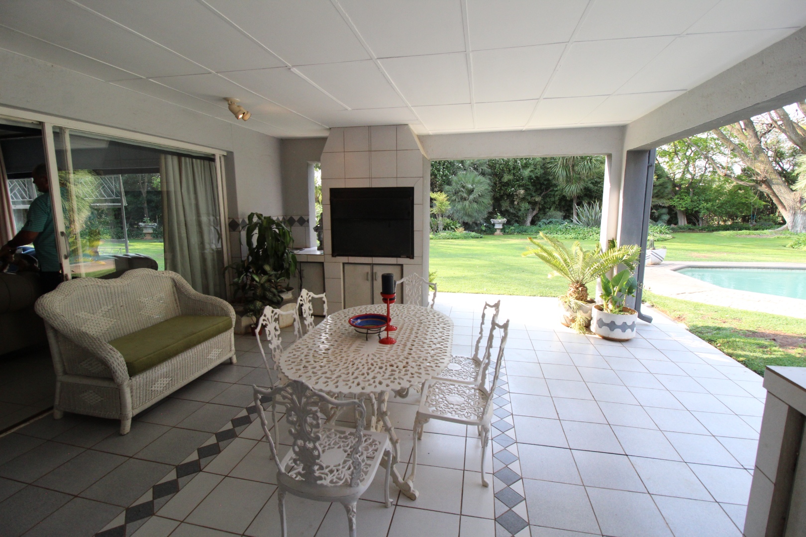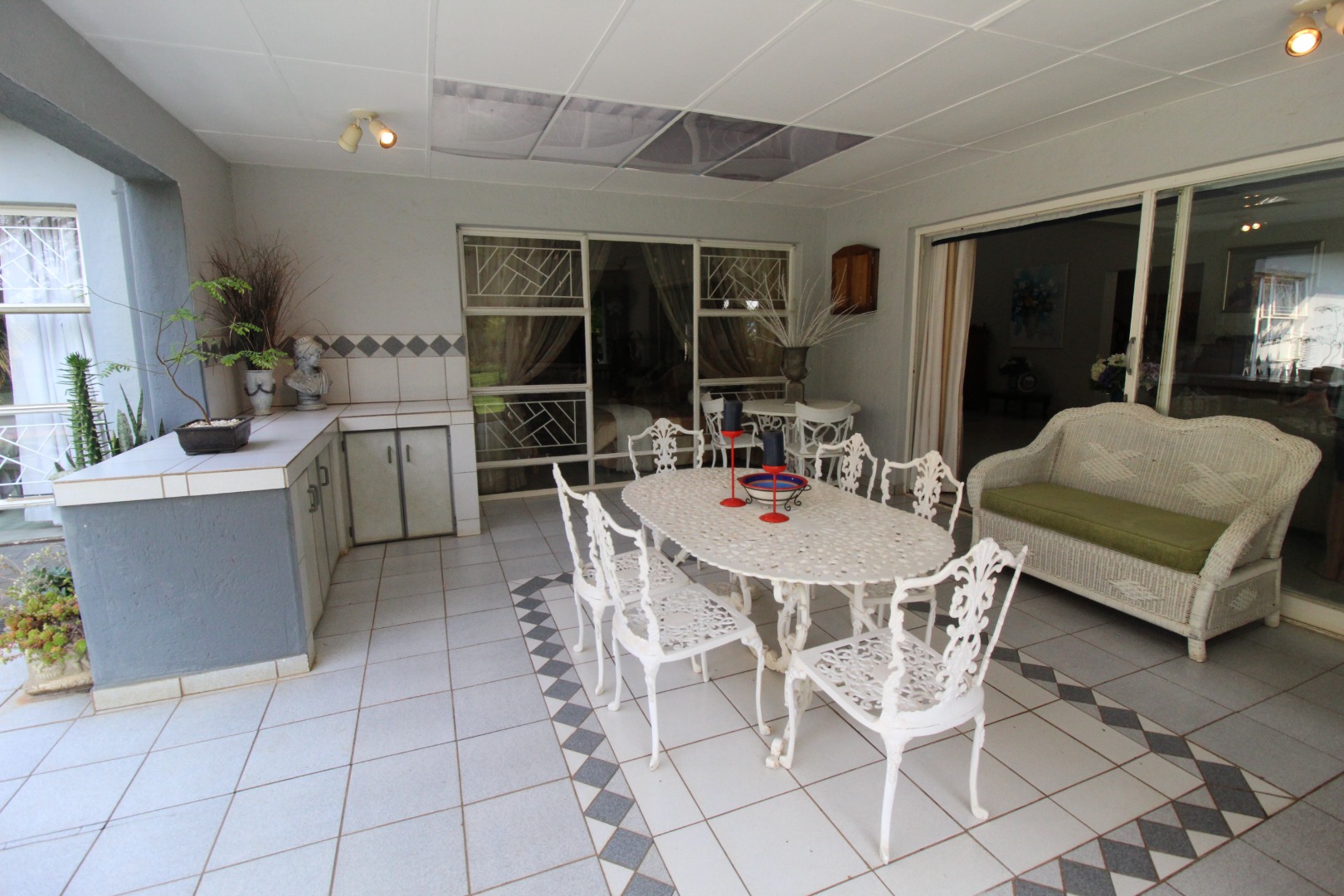 Entertaining is made effortless with a covered patio that leads to a sizeable entertainment space, enhanced by a built-in braai. Overlooking this area is a sparkling swimming pool, set within a beautifully maintained garden, supported by a borehole and irrigation system for year-round convenience.