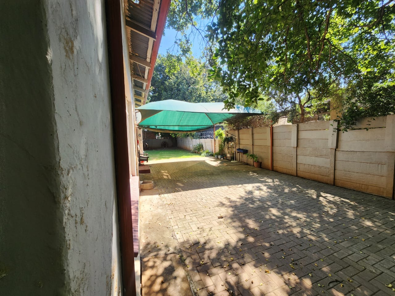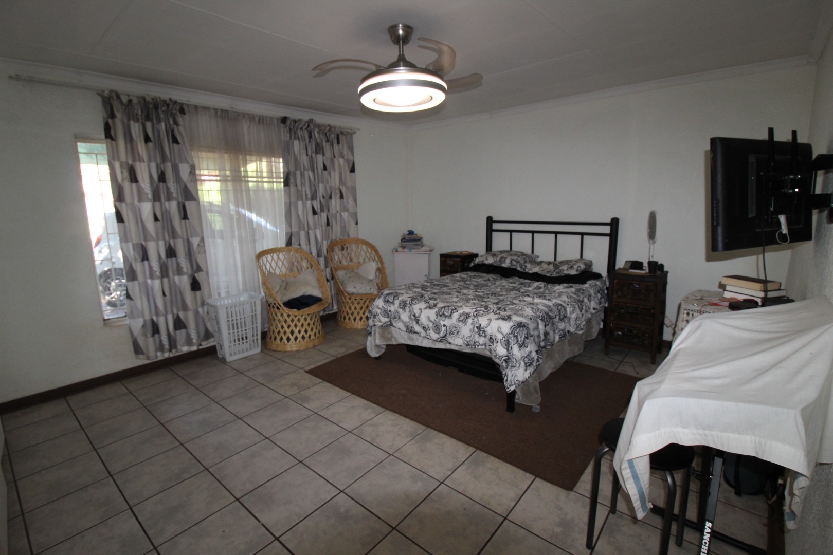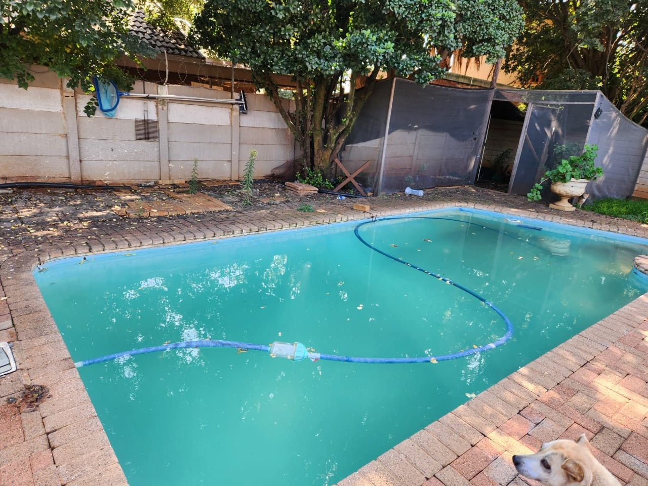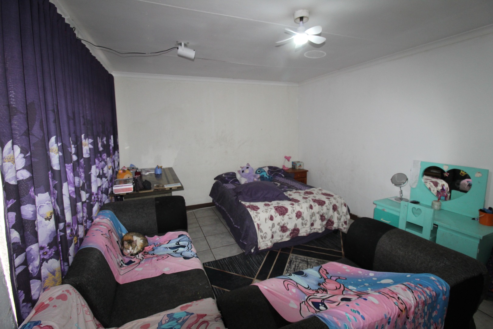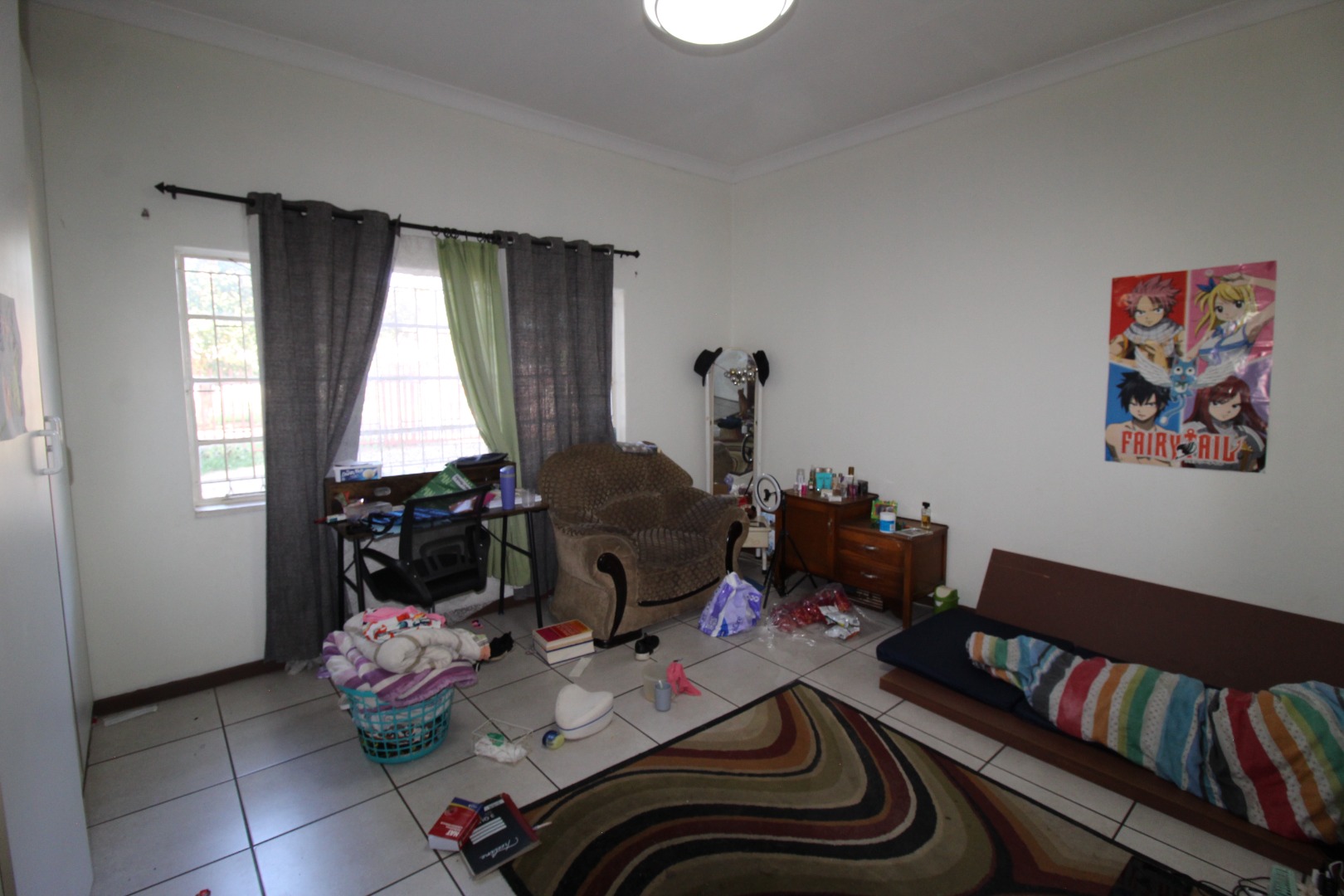 The main residence comprises a welcoming entrance hall, five well-sized bedrooms fitted with built-in cupboards, and three bathrooms. The living areas include a spacious open-plan lounge and kitchen, ideal for comfortable family living and entertaining. Additional features include prepaid electricity, two carports, paved areas, a well-maintained garden, and a swimming pool. The property further offers a storage room, an alarm system, and is fully enclosed with secure fencing.