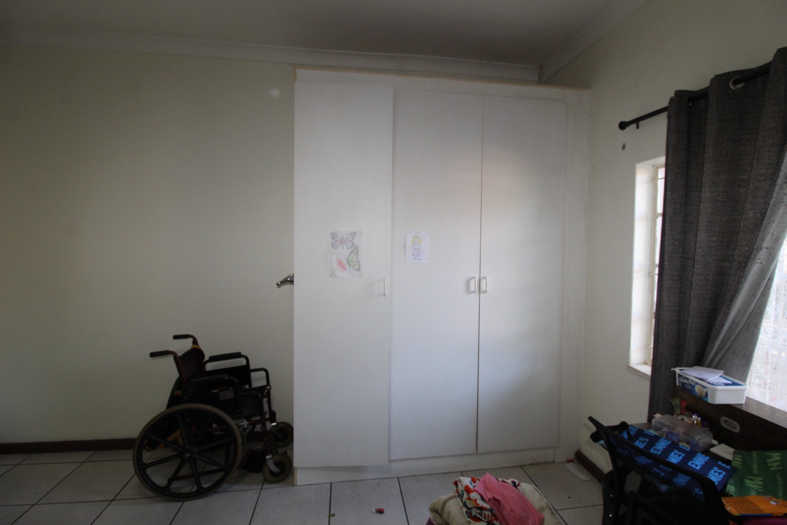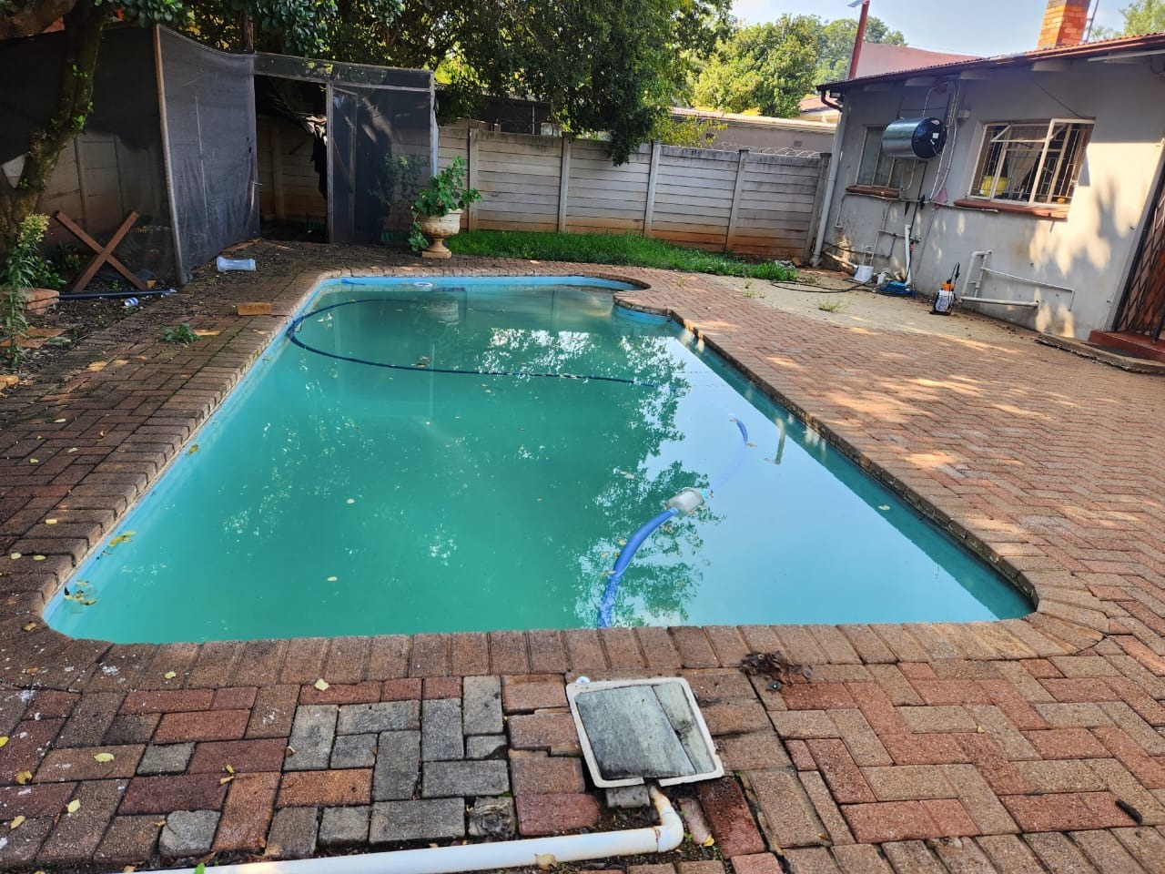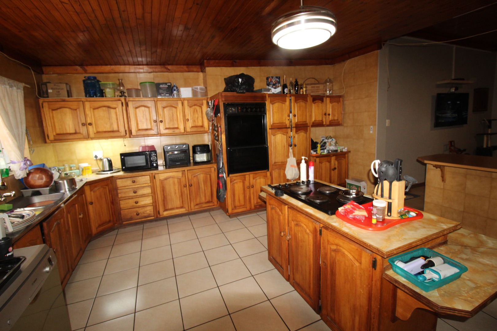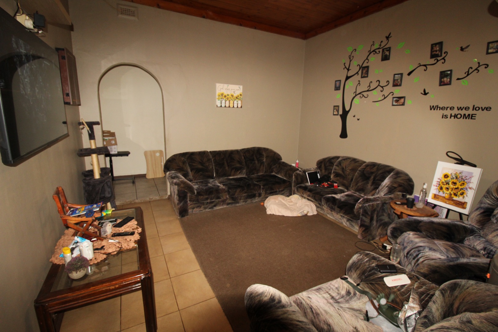 The main residence comprises a welcoming entrance hall, five well-sized bedrooms fitted with built-in cupboards, and three bathrooms. The living areas include a spacious open-plan lounge and kitchen, ideal for comfortable family living and entertaining. Additional features include prepaid electricity, two carports, paved areas, a well-maintained garden, and a swimming pool. The property further offers a storage room, an alarm system, and is fully enclosed with secure fencing.
