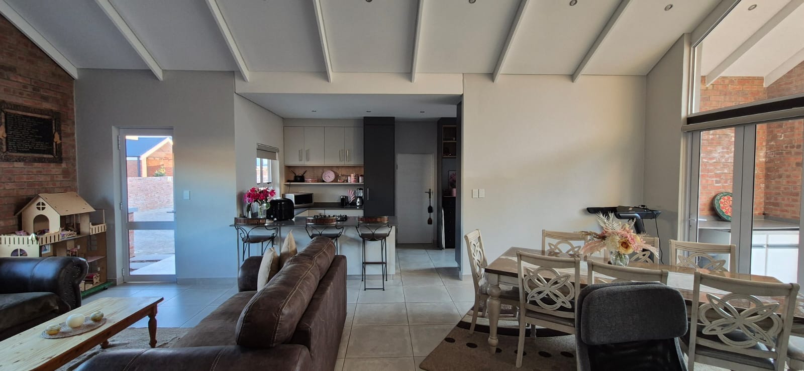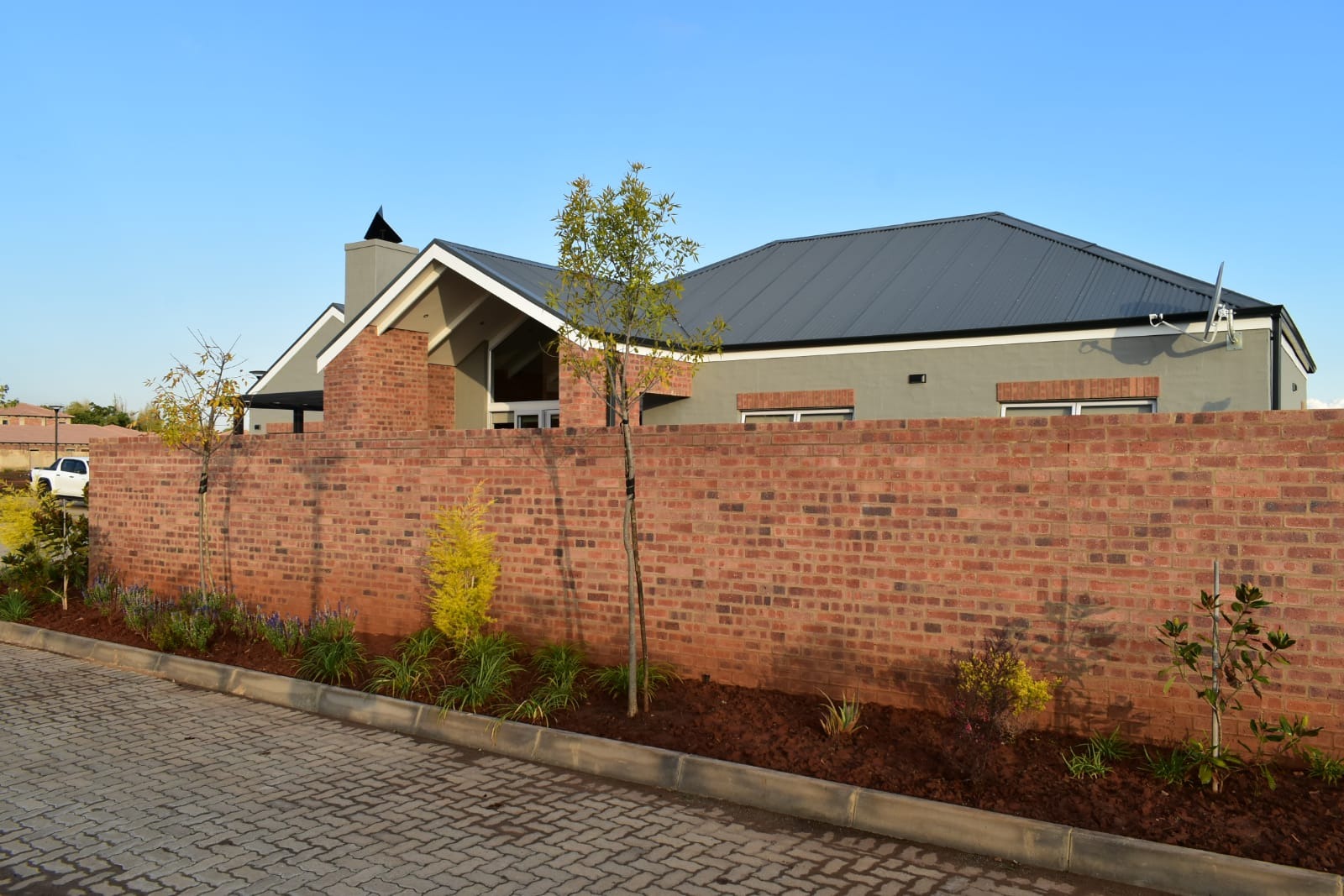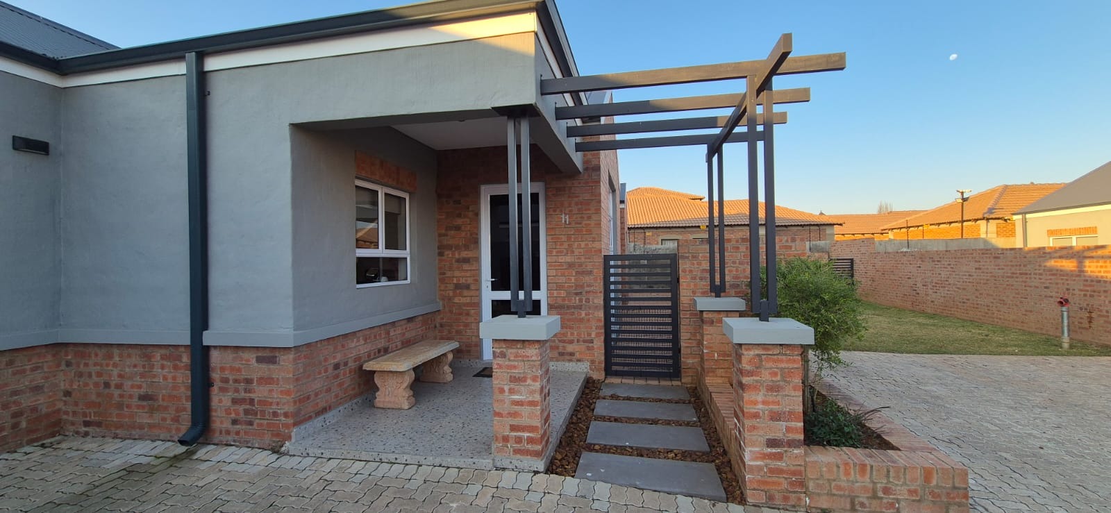 The estate features 30 exclusive, free-standing full-title units, each meticulously designed with modern, high-end finishes: soaring exposed ceilings in the living areas, double-volume windows that frame the patio, Caesarstone kitchen countertops, gas hobs, and elegant face-brick feature walls that add timeless character.