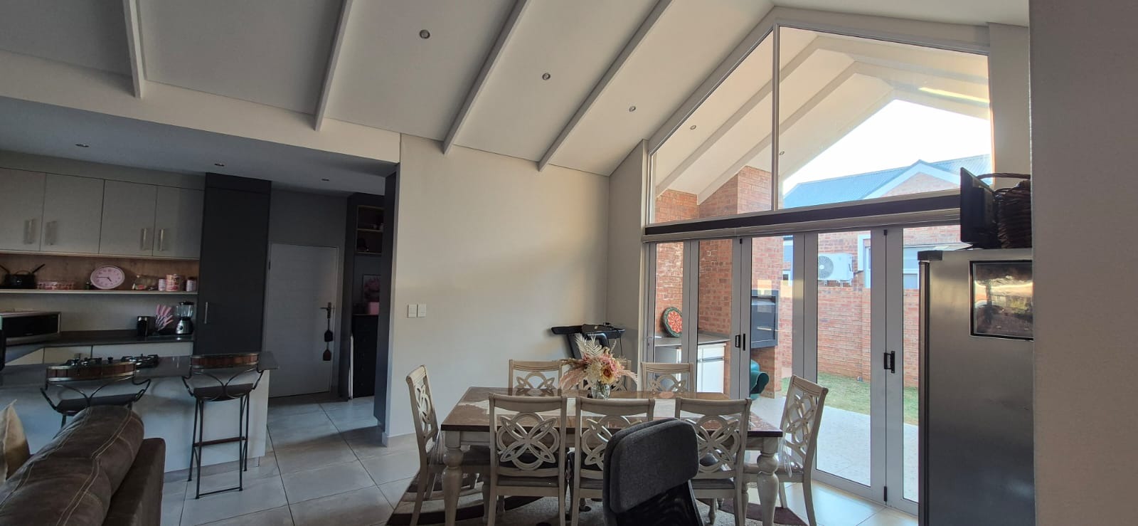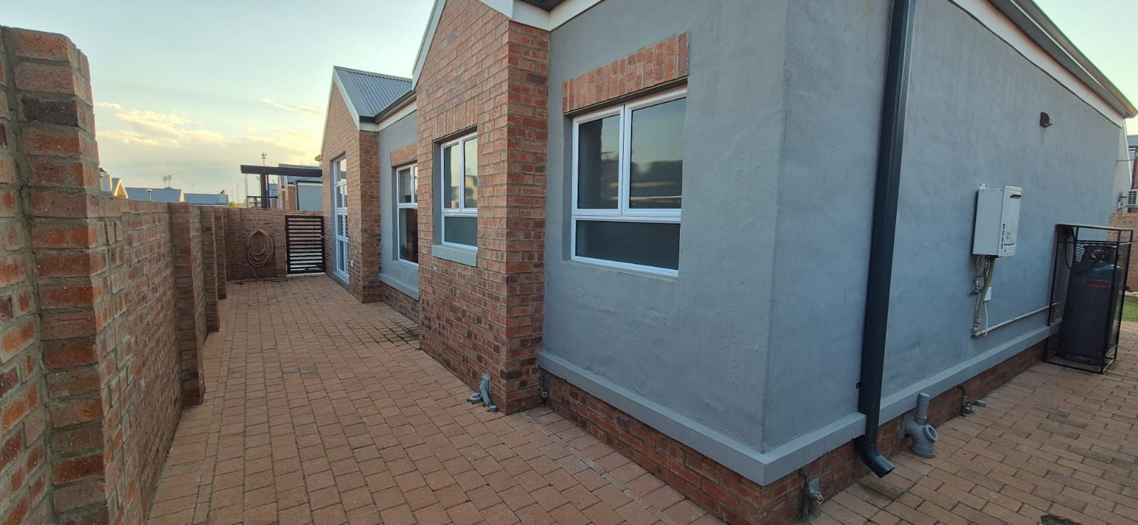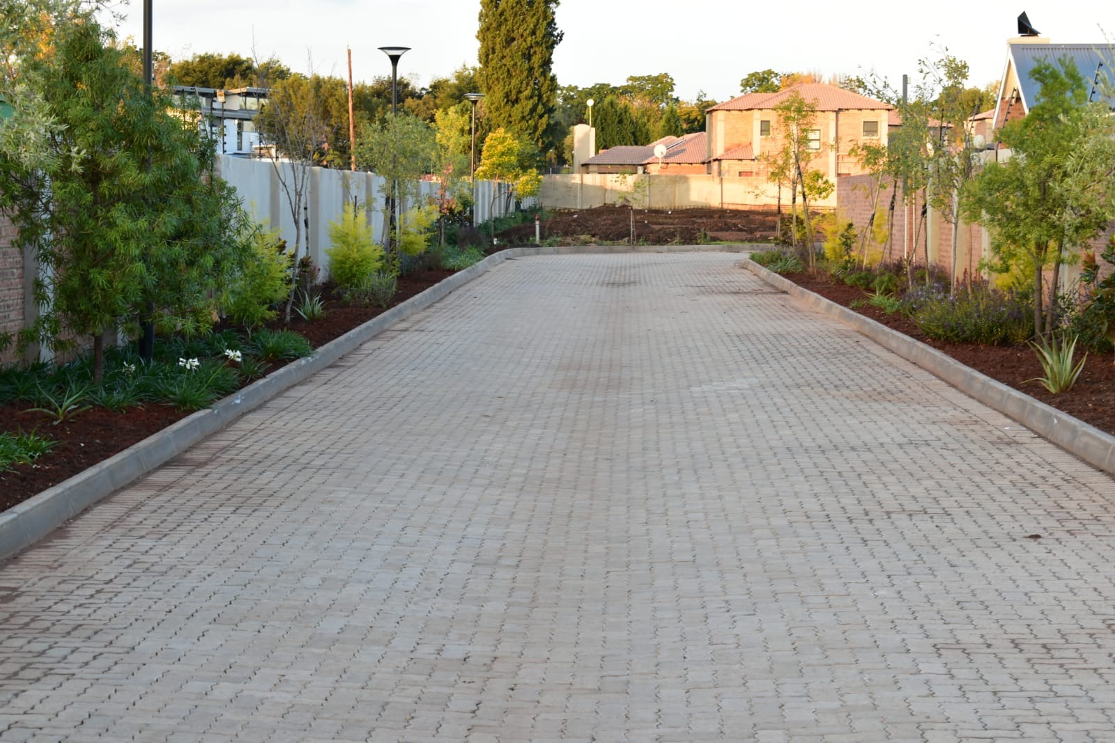 The estate features 30 exclusive, free-standing full-title units, each meticulously designed with modern, high-end finishes: soaring exposed ceilings in the living areas, double-volume windows that frame the patio, Caesarstone kitchen countertops, gas hobs, and elegant face-brick feature walls that add timeless character.
