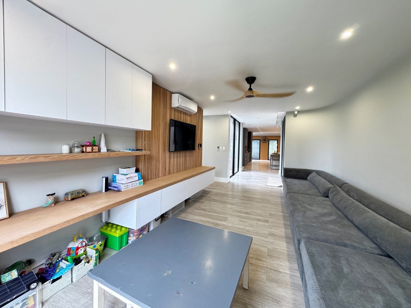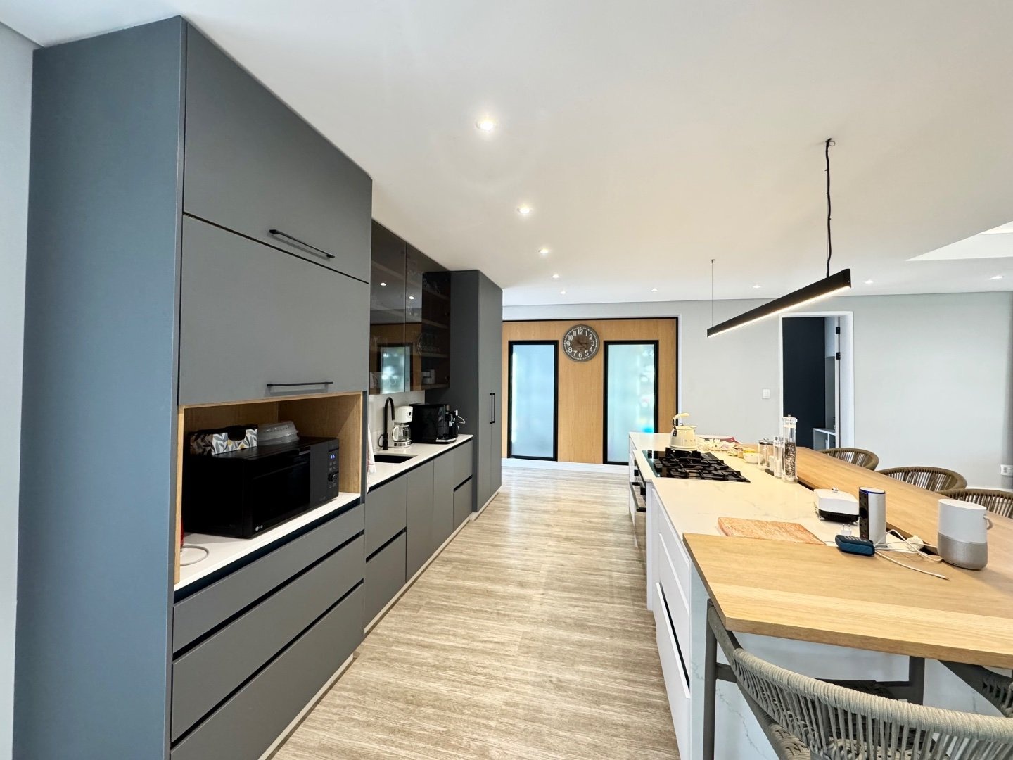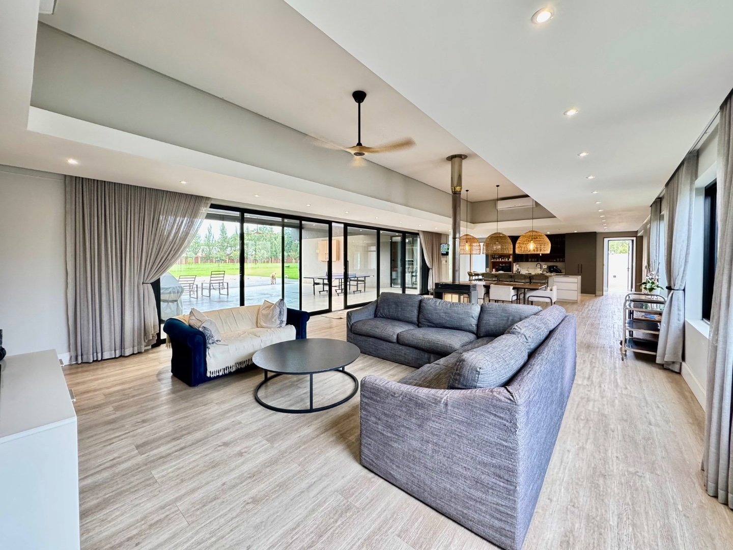 Designed with entertainment in mind, the well-appointed kitchen is a chef’s dream, offering ample counter space, two walk-in fridges, separate scullery, and a dedicated washing room. The open-plan design flows effortlessly into the living and dining areas, creating an inviting atmosphere for gatherings. A second family room provides additional space for relaxation, perfect for casual lounging or movie nights, ensuring ample room for every member of the household.