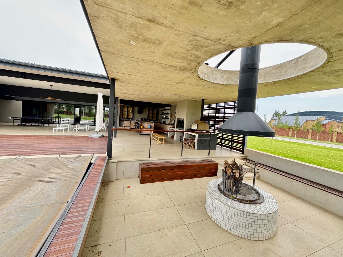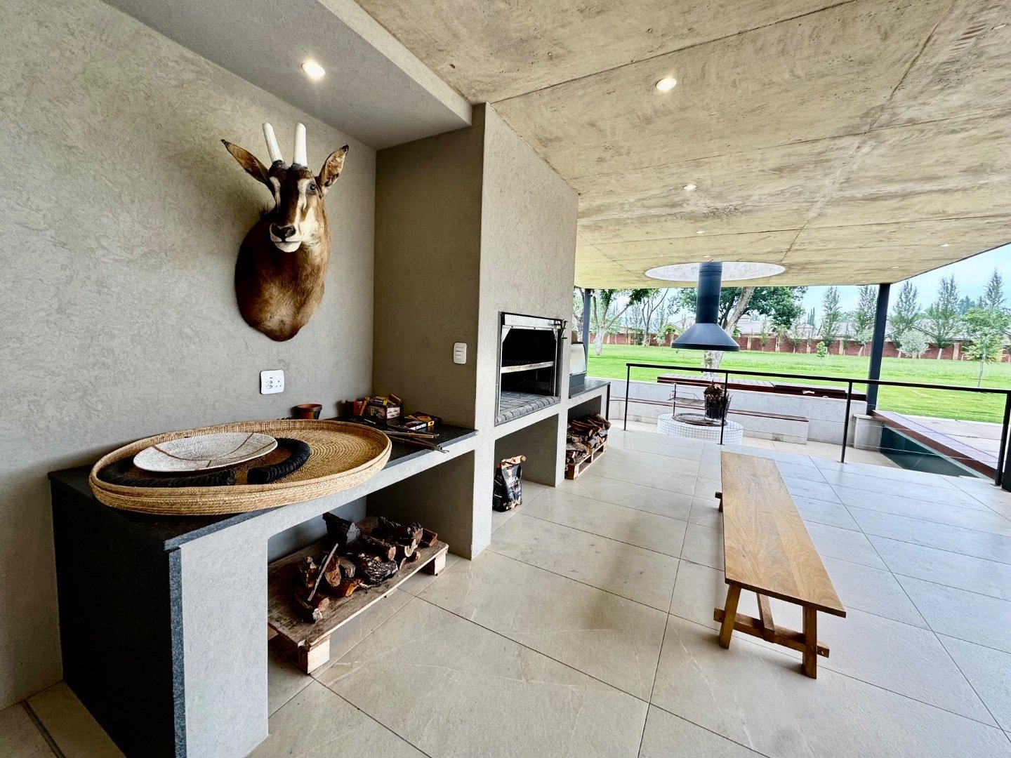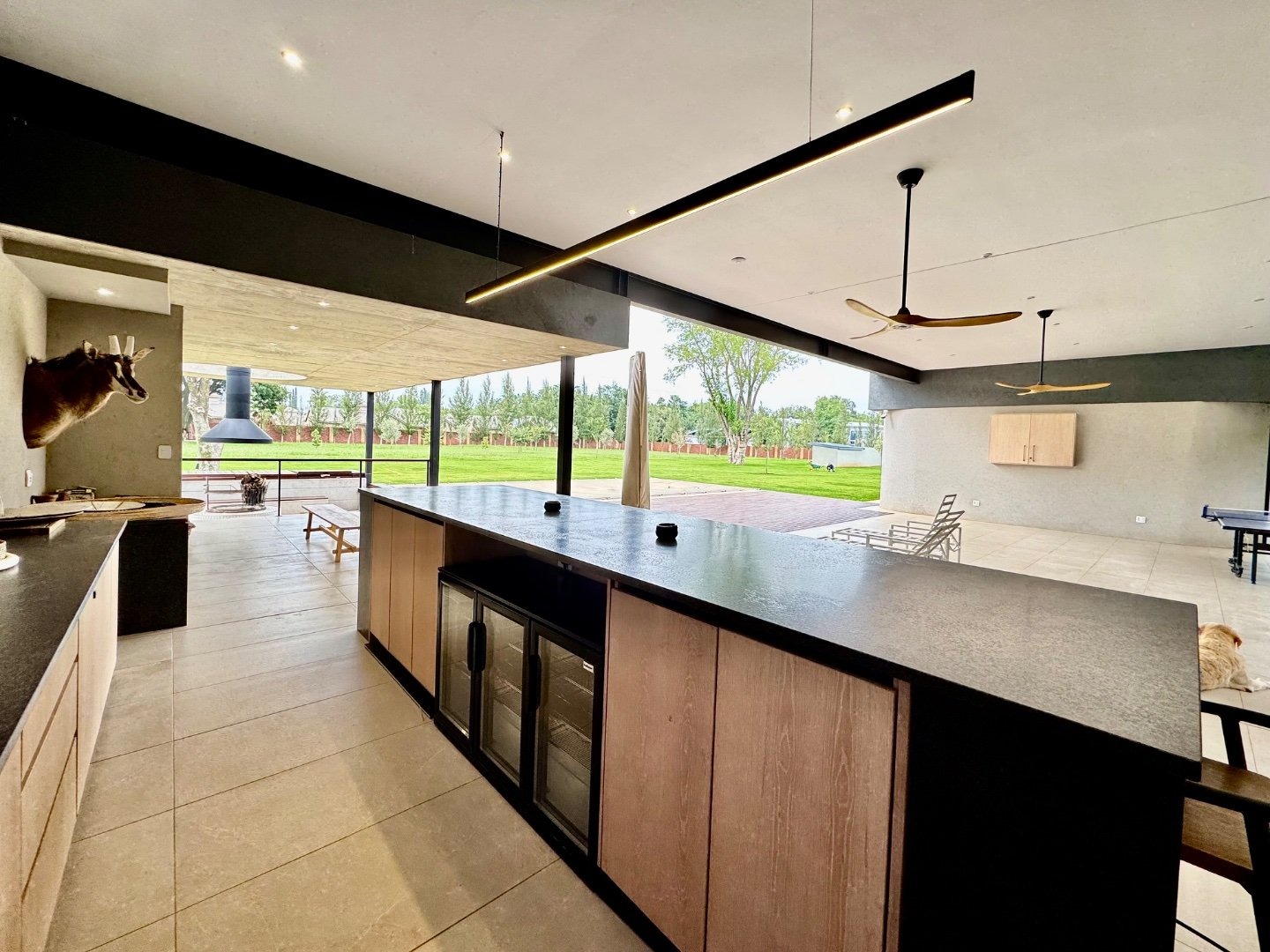 Extending from the main living areas, the north-facing patio offers breathtaking views of the lush, manicured gardens and sparkling swimming pool. This home is built for hosting, with an expansive covered entertainment area featuring a built-in bar, braai, pizza oven, and a sunken boma, creating the perfect setting for memorable gatherings.