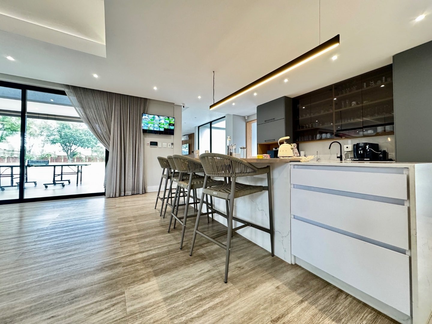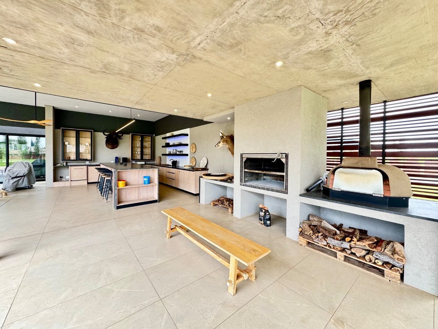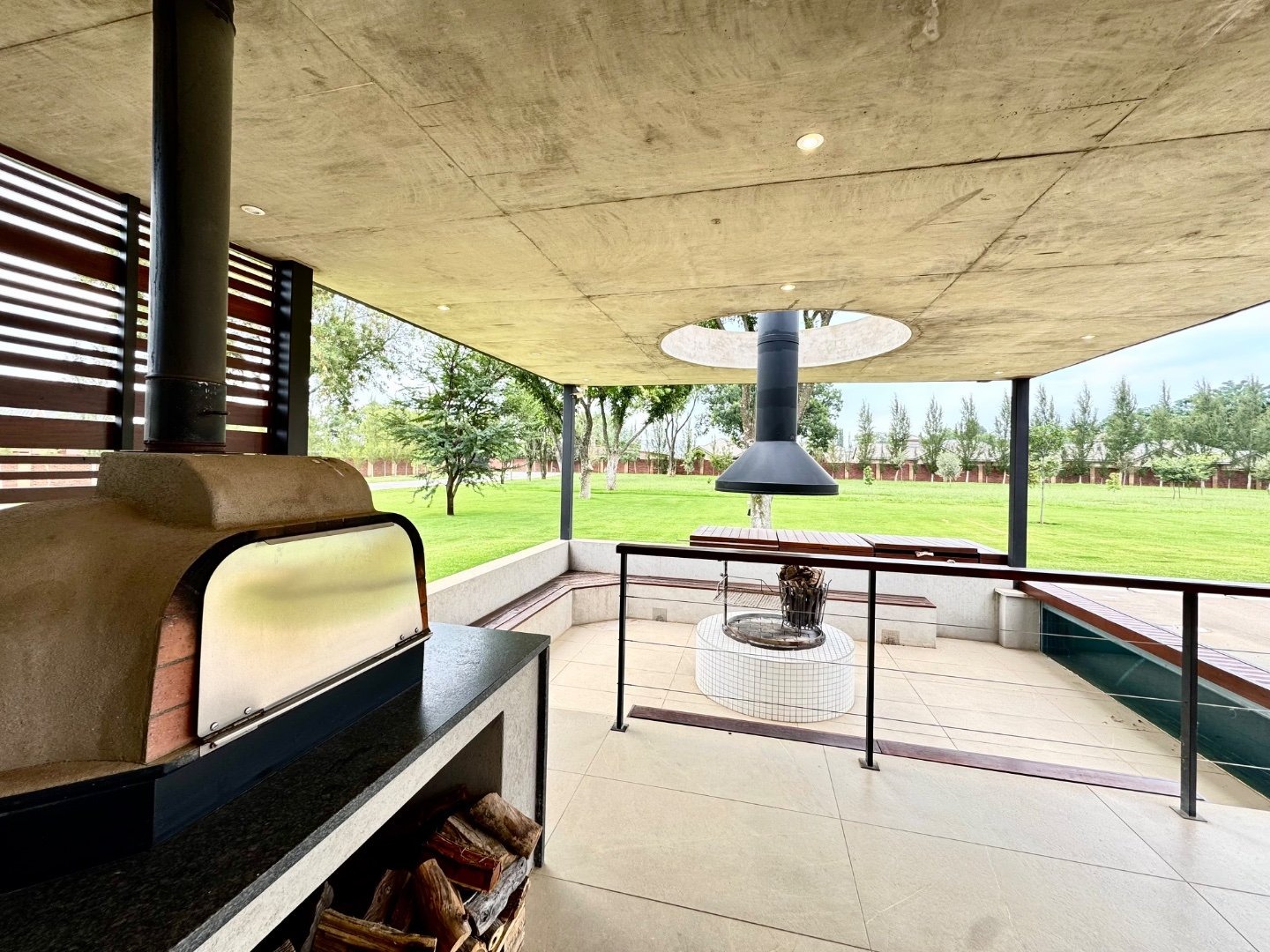 Extending from the main living areas, the north-facing patio offers breathtaking views of the lush, manicured gardens and sparkling swimming pool. This home is built for hosting, with an expansive covered entertainment area featuring a built-in bar, braai, pizza oven, and a sunken boma, creating the perfect setting for memorable gatherings.