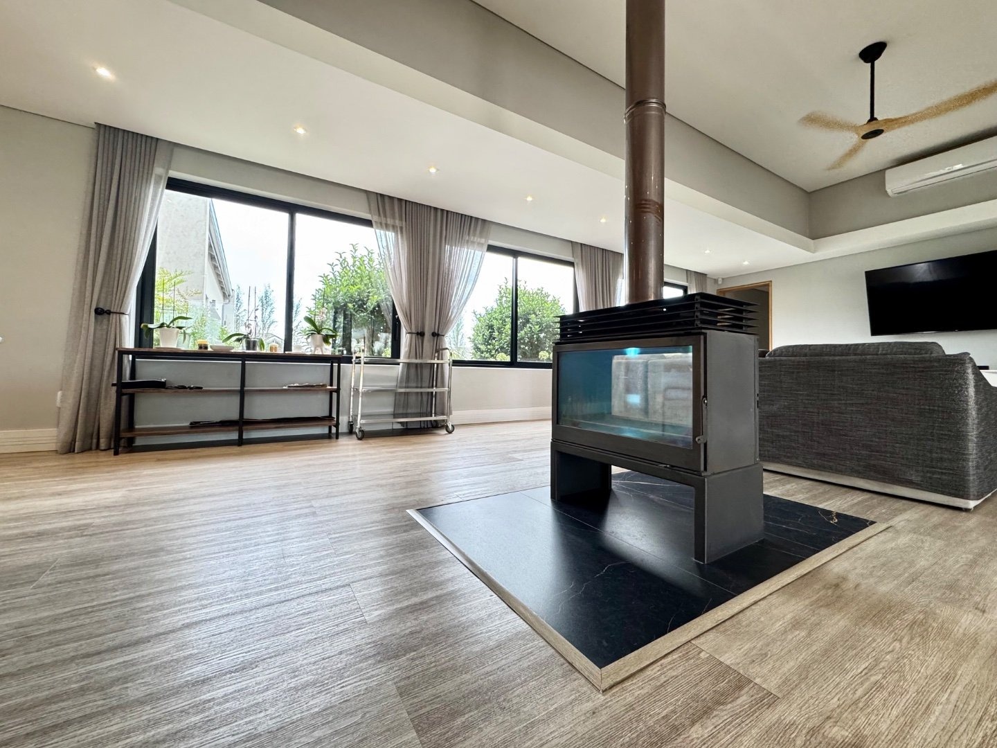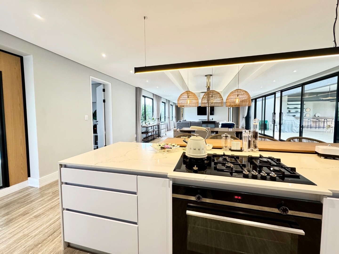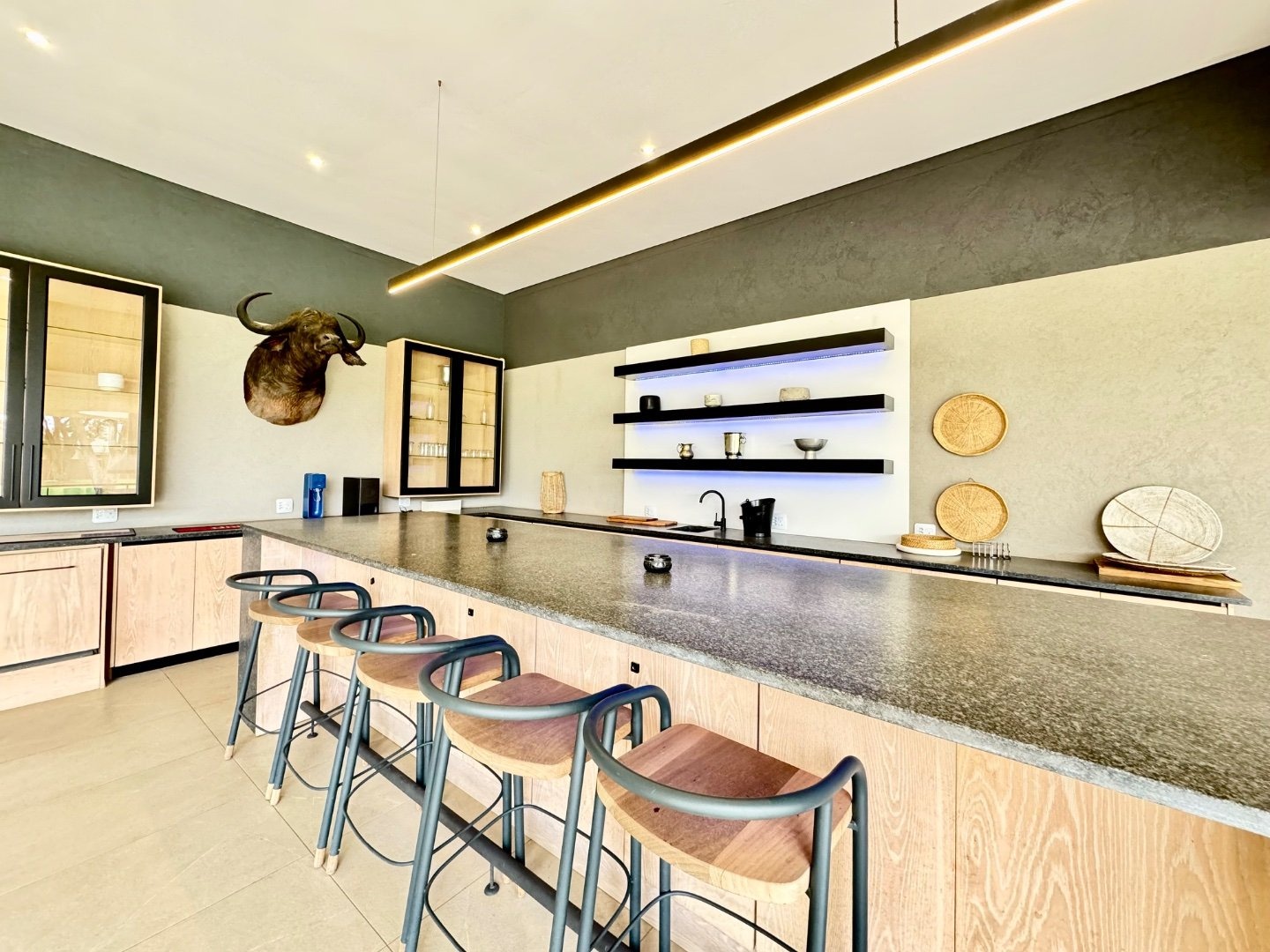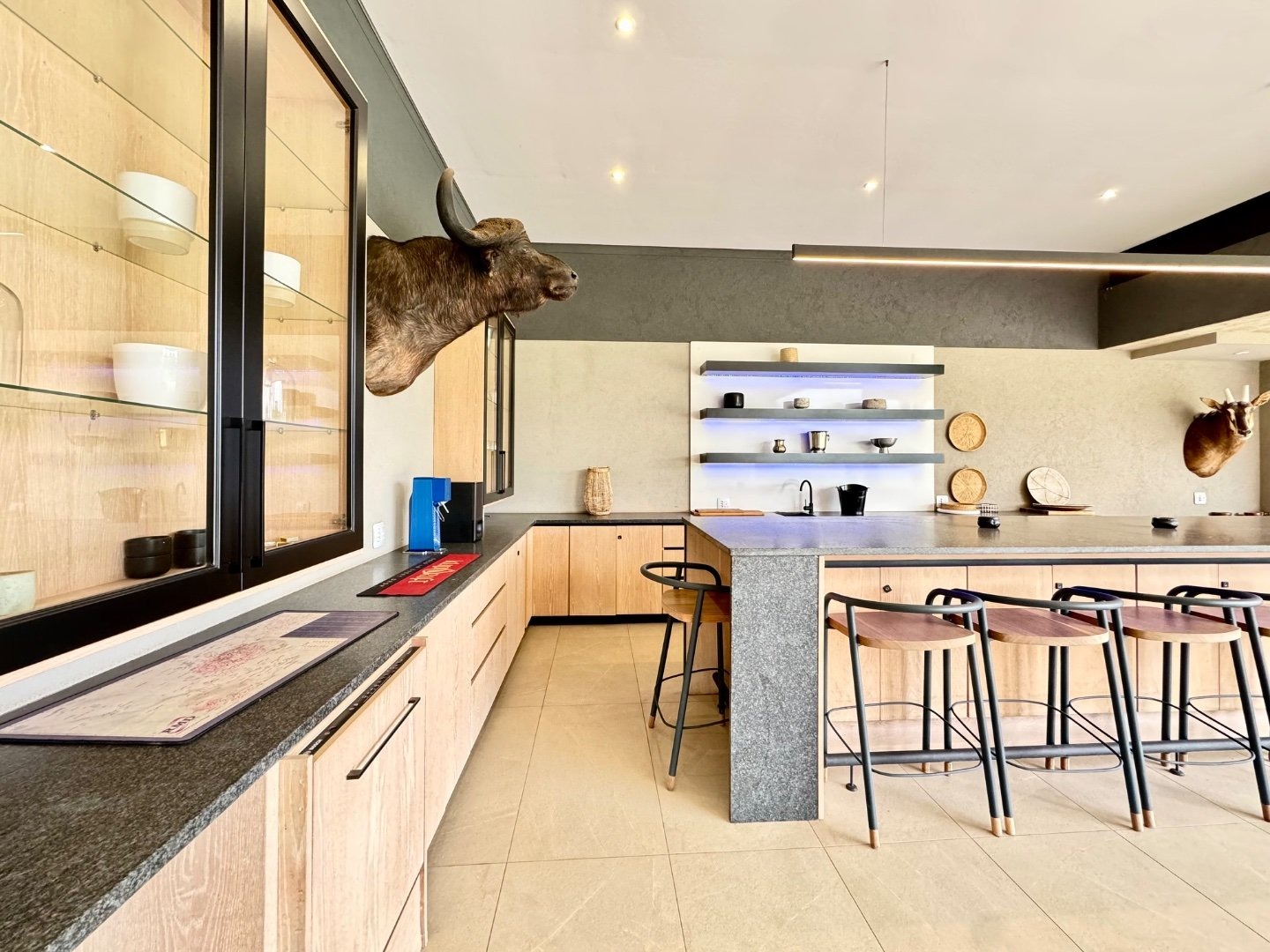 Beyond its striking aesthetics, this home is designed for off-grid, sustainable living, with a full solar system and a 36kW inverter ensuring uninterrupted power. Two strong boreholes, an electronic irrigation system, and a water filtration system guarantee a reliable and eco-friendly water supply. Comfort is prioritised throughout, with nine air conditioning units and two fireplaces.