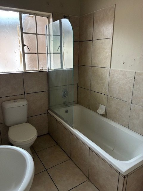 The bathroom has a bath and shower in bath and place for a washing machine.