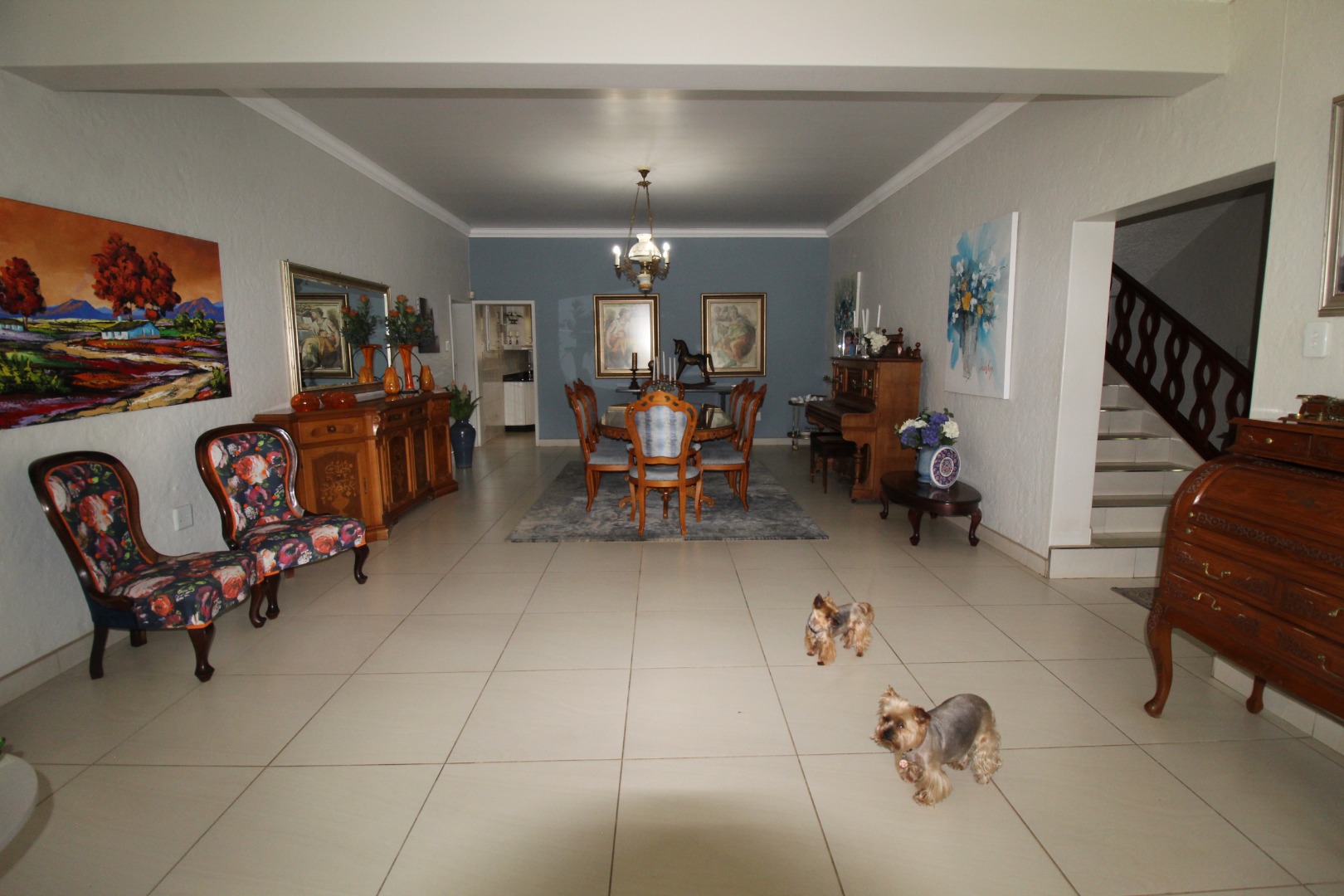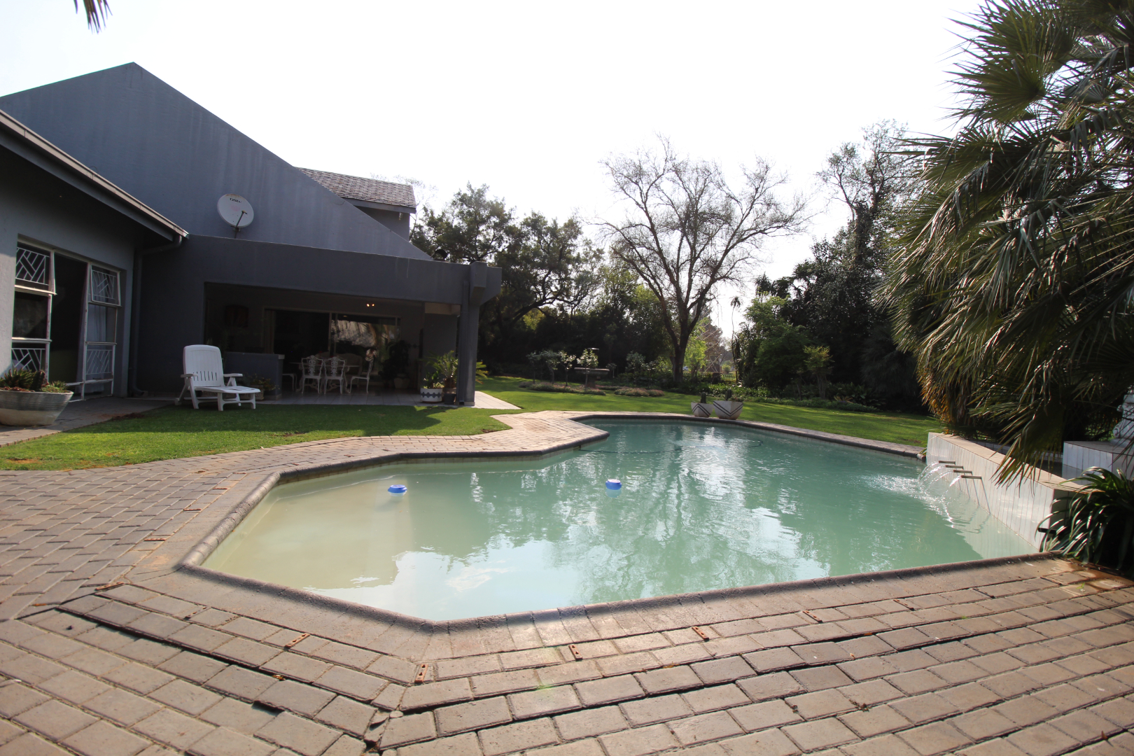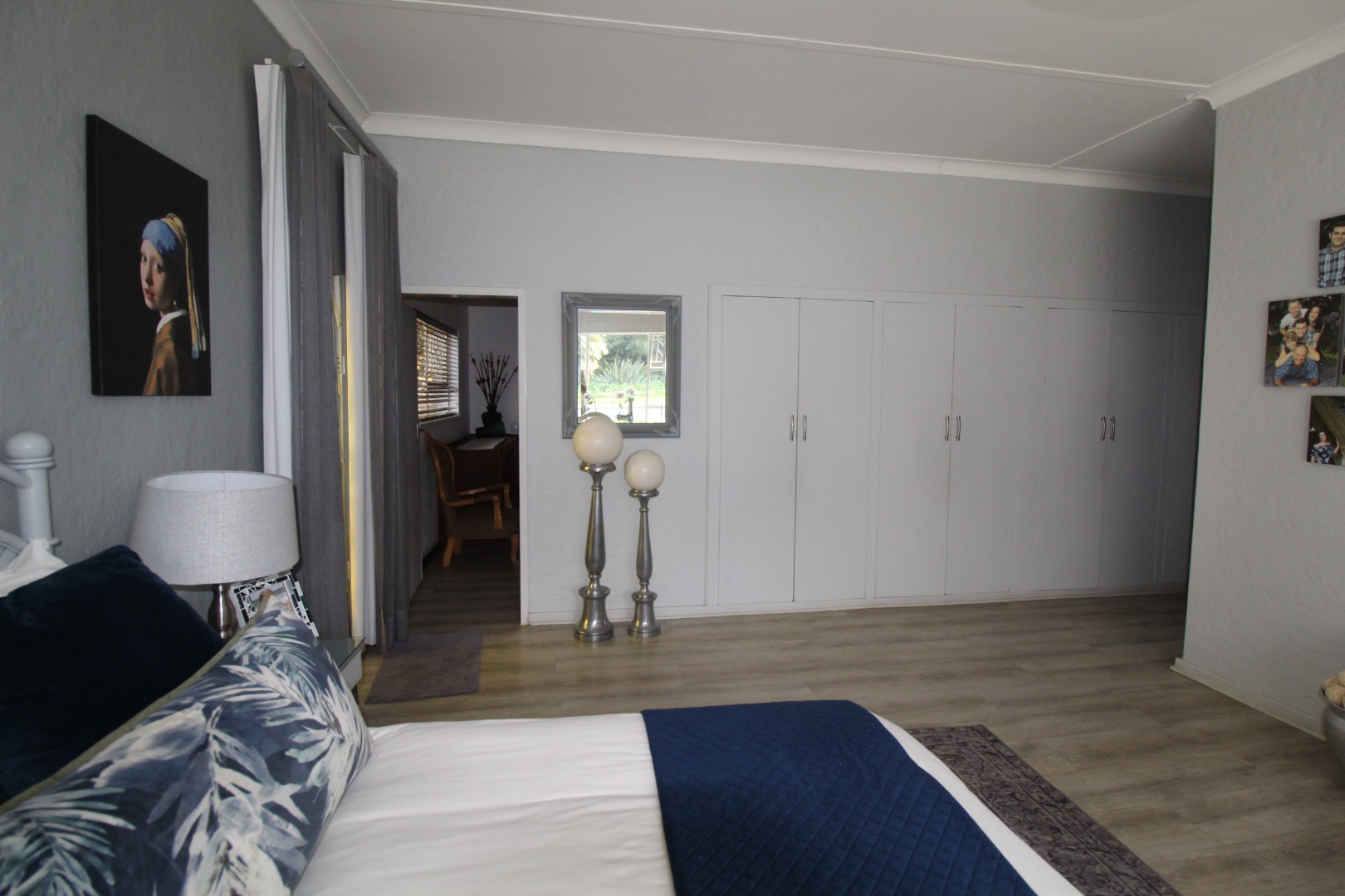 Entertaining is made effortless with a covered patio that leads to a sizeable entertainment space, enhanced by a built-in braai. Overlooking this area is a sparkling swimming pool, set within a beautifully maintained garden, supported by a borehole and irrigation system for year-round convenience.